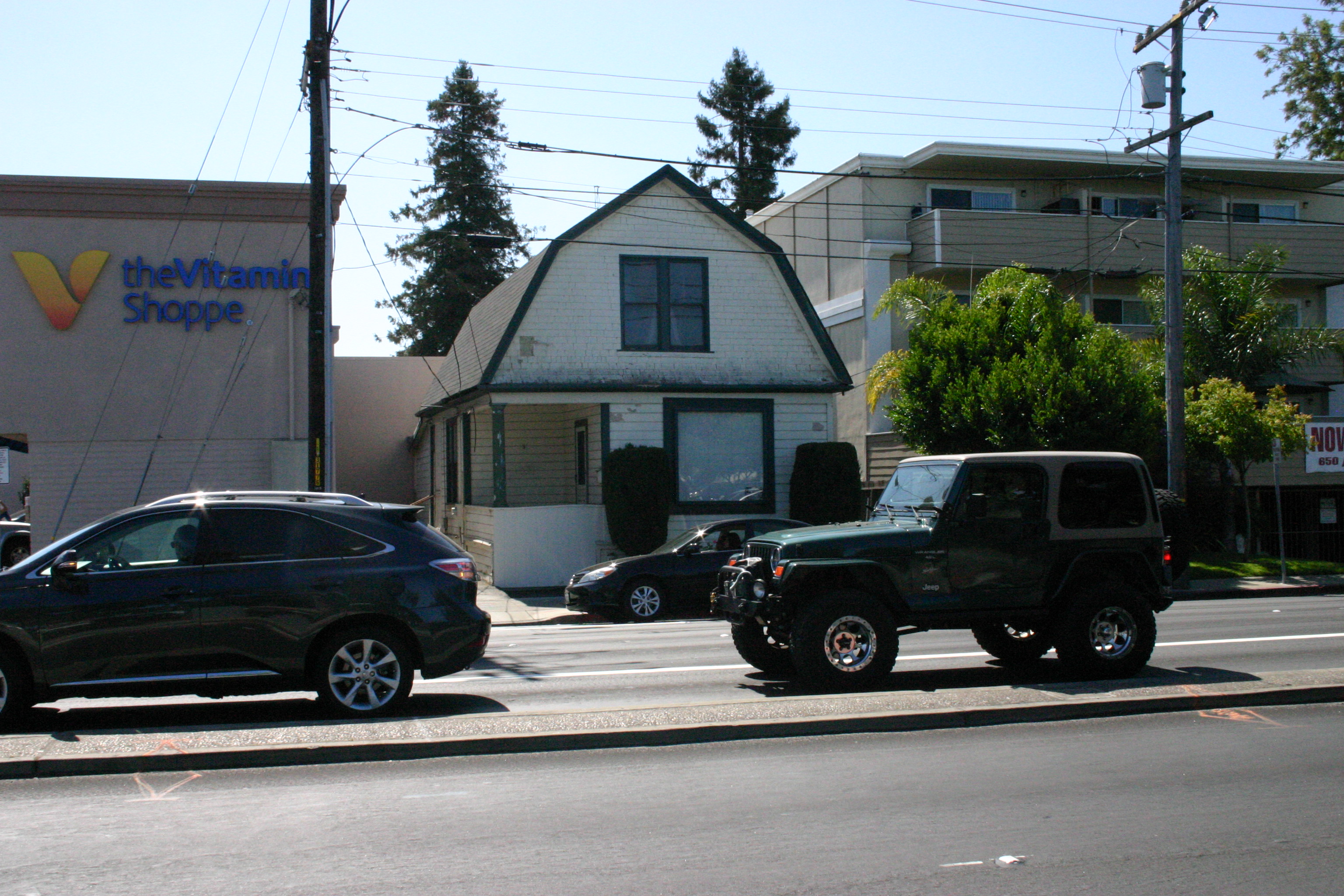 This curious little house had a construction fence in front of it all during the Vitamin Shoppe remodel, and a close look reveals that the back wall of the L-shaped “shoppe” actually touches the back of this little house. Thus, both buildings presumably have the same owner, and in fact they may be physically connected. The house appears to be unoccupied, and indeed it was inaccessible during the Vitamin Shoppe construction. I cannot help but wonder why it still stands: why didn’t they tear it down and either use the site for additional parking or expand the commercial building into this space? This is a mystery that I still aim to get to the bottom of.
