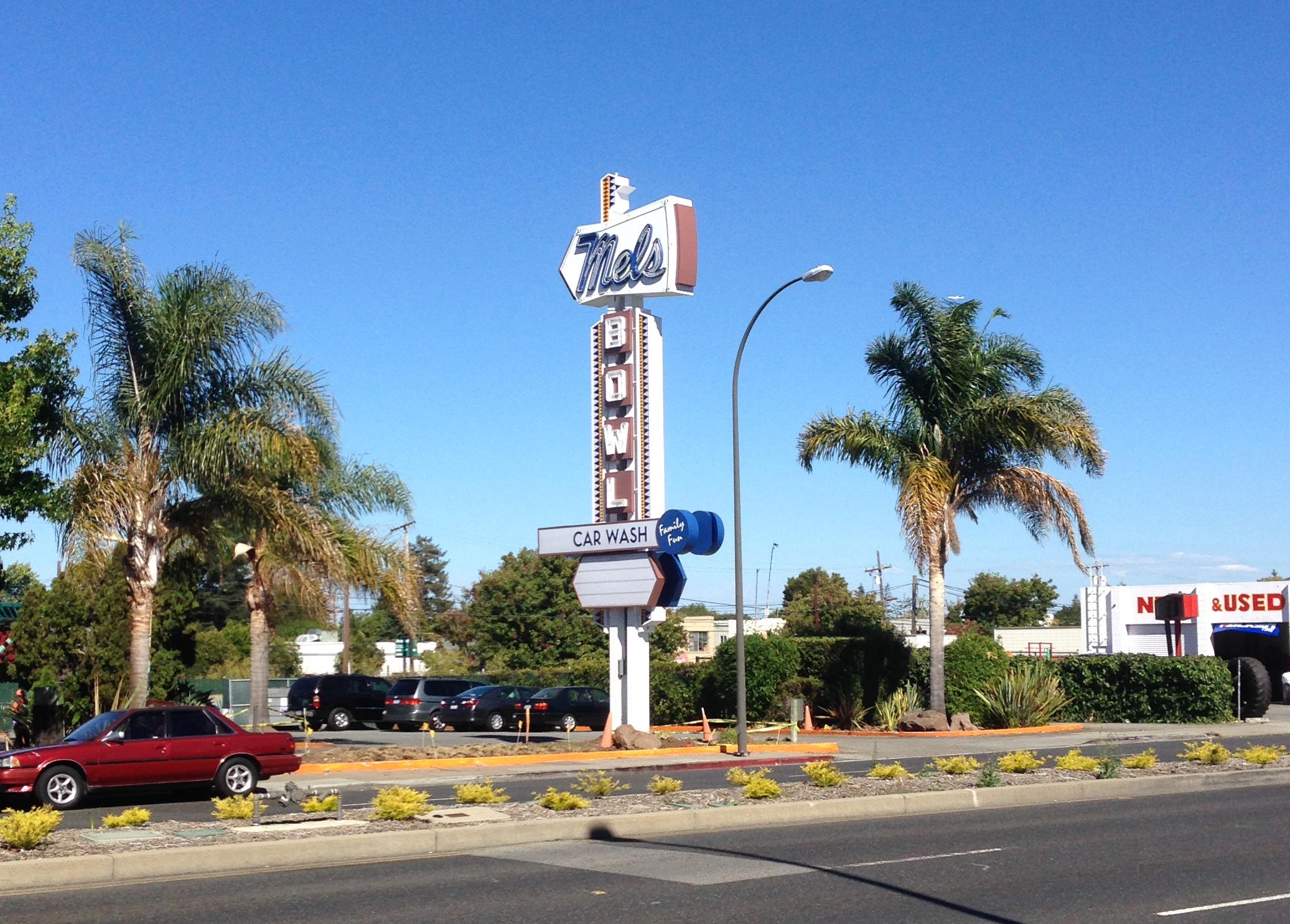 It seems that when Mel’s Bowl was being torn down (to be replaced by a rather large apartment complex now under construction—I’ll get to that in a later post), the developers agreed to try to preserve the sign in some fashion. Exactly how it got to the car wash, I’m not sure, but I’m very pleased to see that the sign was not only moved, it was redone. And I must say, they’ve done a magnificent job. The sign is in great shape. I have yet to see it at night: hopefully they light it up (although I wouldn’t be entirely surprised if it remains dark, given that the car wash is closed at night). But regardless, I am delighted to see that a bit of Mel’s Bowl lives on, and that someone in this town has a bit of respect for Redwood City history.