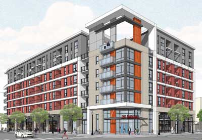 I have heard some speculation on just how high this building is going to be. There is a simple answer to this question, and a more complicated one. The simple answer is that the building will rise to 85 feet above ground level (and will extend a little over 9 feet below ground). But how many stories is it? That turns out to be a tougher question to answer. Look at the above illustration and count the number of stories. What number do you get? Six? Seven? Eight? In fact, there are five levels of apartments: the four reddish levels plus the grey level on top, which, although it looks to be two levels, is really only one double-height level (with some interior lofting; I’ll get to that in a bit). The ground level, which is visibly taller than the four above it, is one tall story when viewed from the street, but is actually two levels of parking faced with three high-ceilinged “live/work” units (i.e., retail), a fitness center, and the building’s lobby. So, how many stories is that? It depends upon how you count…