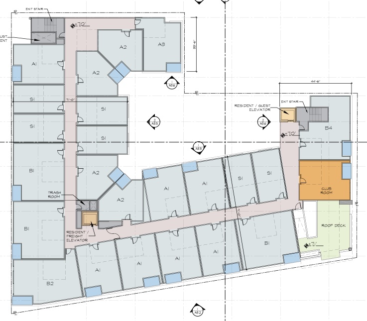 This photo, taken from across the tracks near Peet’s Coffee, shows the final height of the building (other than what will be needed for the flat roof that goes on top). The plywood and framing above the four floors clad in yellow mark the double-height top floor. From the inside, the portion of these top floor apartments against the windows have 20 foot ceilings; presumably this is the “living room” portion of the apartment. Away from the windows, over the entry door, these apartments have a loft (on the plan, these are referred to as “mezzanines,” which I believe is a fancy name for “loft”). To make this clearer, here is the floor plan for the top level: