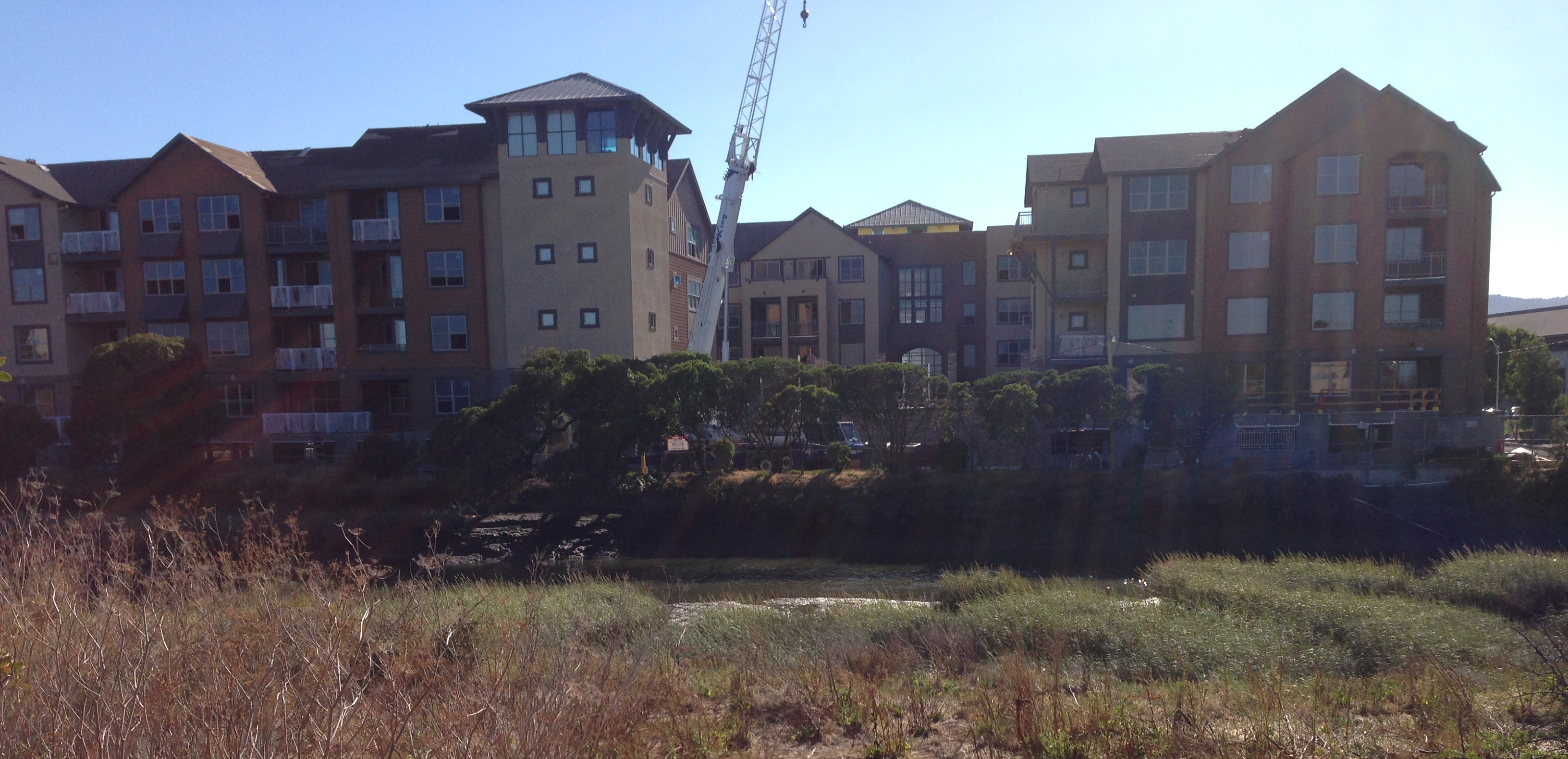 This project was originally going to be a 100-unit condominium complex. But after a change in developers we wound up with 132 luxury apartments of varying sizes spread across four floors, with below-ground parking. The apartment building is located on Redwood Creek directly across from Toys R’ Us; from the back of the store you can get a good view of the back side of the complex as well as peek into the common area that resides in the center of the C-shaped building: