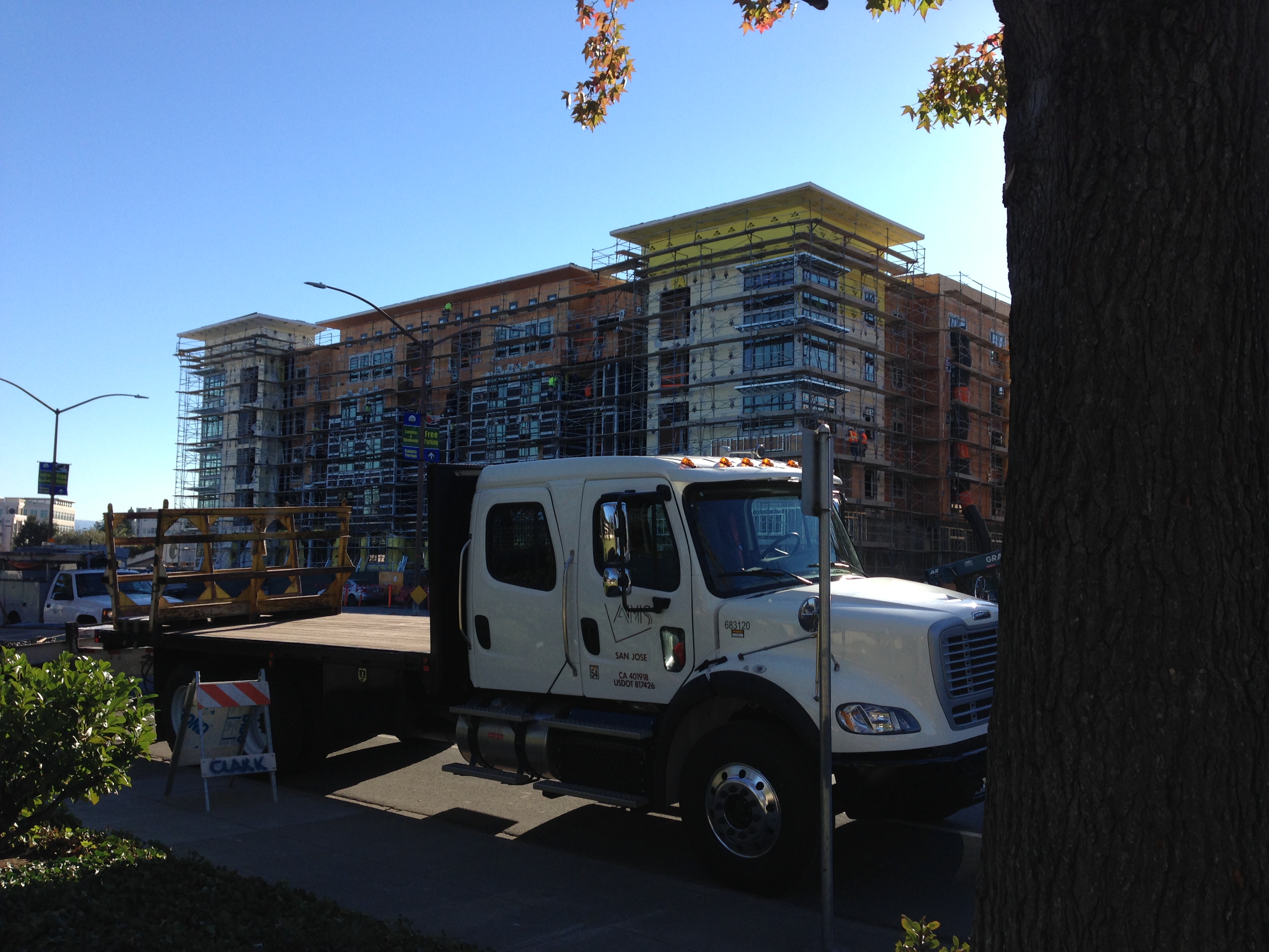 Walking down Hopkins towards El Camino you can now see the apartments being built at 640 Veterans Blvd (“The Radius Apartments”) looming over the businesses on El Camino and the low-rise apartments and homes in the Mezes Park area. At 5½ stories, the fresh lumber and plywood really stands out. My first goal had been to check out the auto dealer on El Camino; I decided to make 640 Veterans my second.