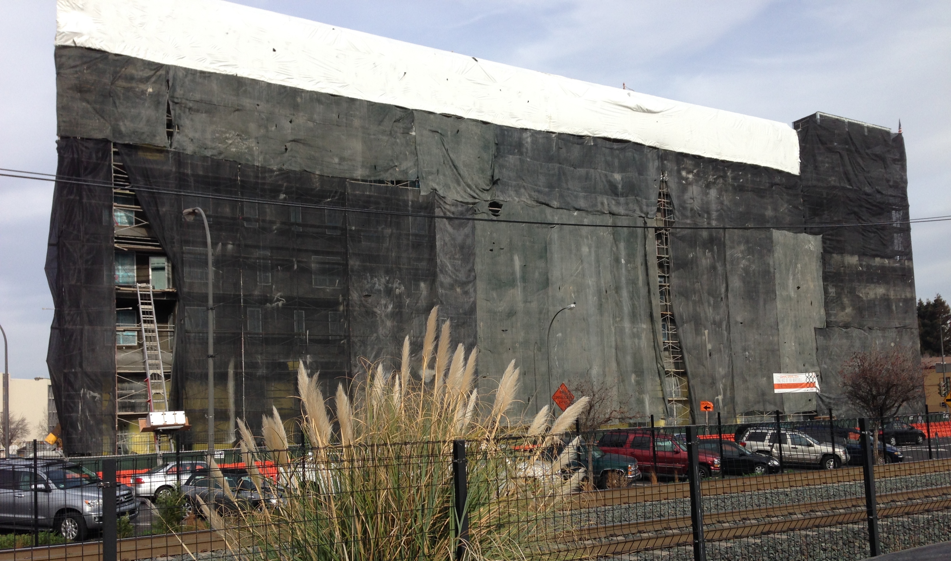 Another sign that 201 Marshall is rapidly being completed is a more literal one: hanging on the protective coverings is a cloth sign proclaiming that you can “Live big in Spring 2014” that also provides a website: 201MarshallApartments.com. Unfortunately the linked page is rather uninformative: it consists of a single web page with a generic photo or two and a “click here” link for interested parties that simply opens an email window. So there is little to be obtained from that website yet, although I expect that over time more information may be added. In any case, “Spring 2014” indicates that the building will be open soon—within the next three months or so.