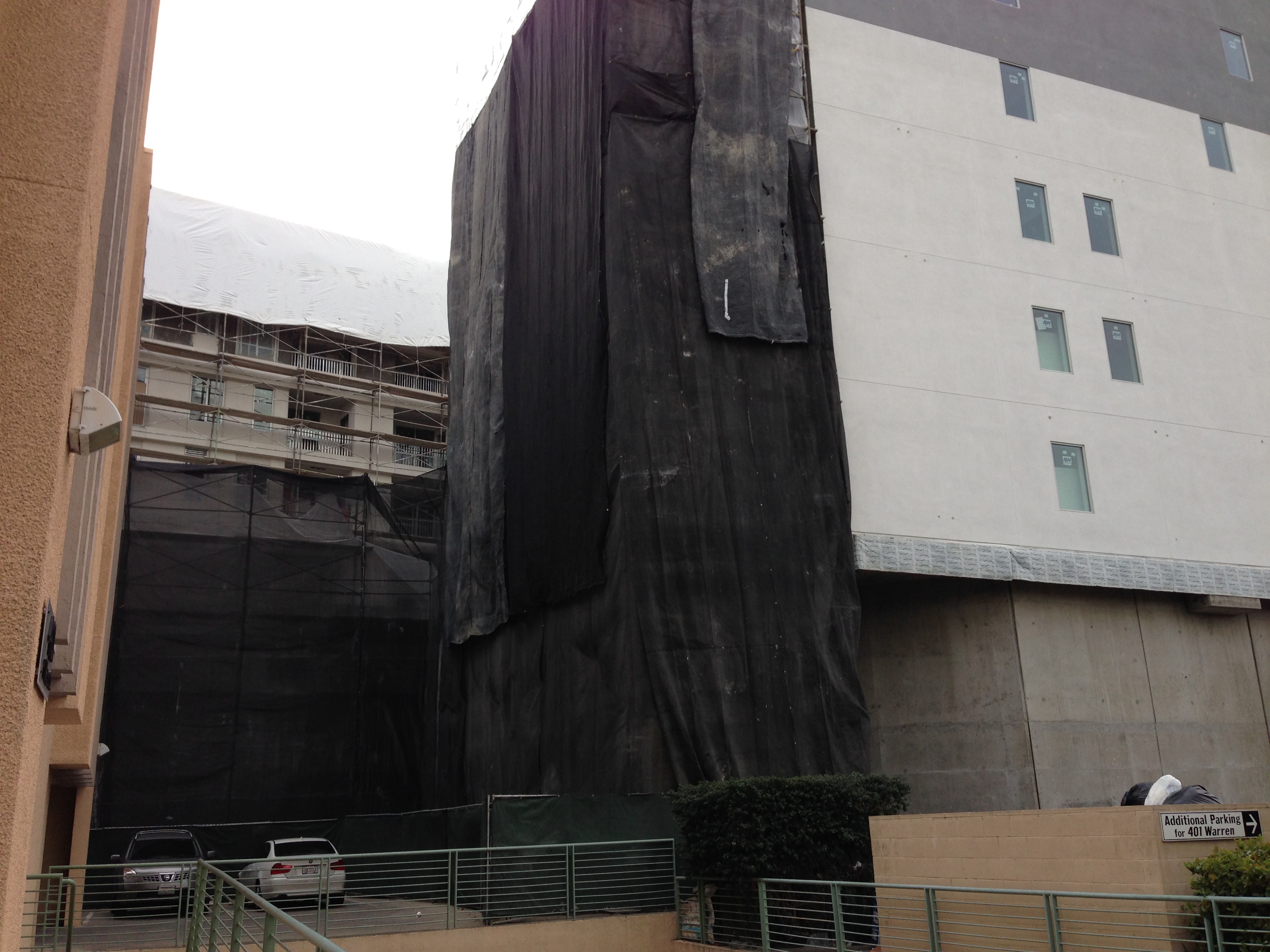 From this angle you can see the varying exterior colors that the completed building will employ. It is hard to tell at this point whether the wall color being used in the inset area (where you can see balconies) is the same as the lighter wall color in the right part of the photo; the inset area looks to have a browner cast, but that may simply be the result of light reflecting off the tan-colored building just peeking into the left edge of the photo. That wall on the right looks rather stark, but don’t expect the same lack of visual interest on the exterior walls facing either Marshall or Arguello. The wall shown here is on Warren St. and faces the San Mateo County jail, and thus isn’t going to be viewed by nearly as many people as the building’s other sides.