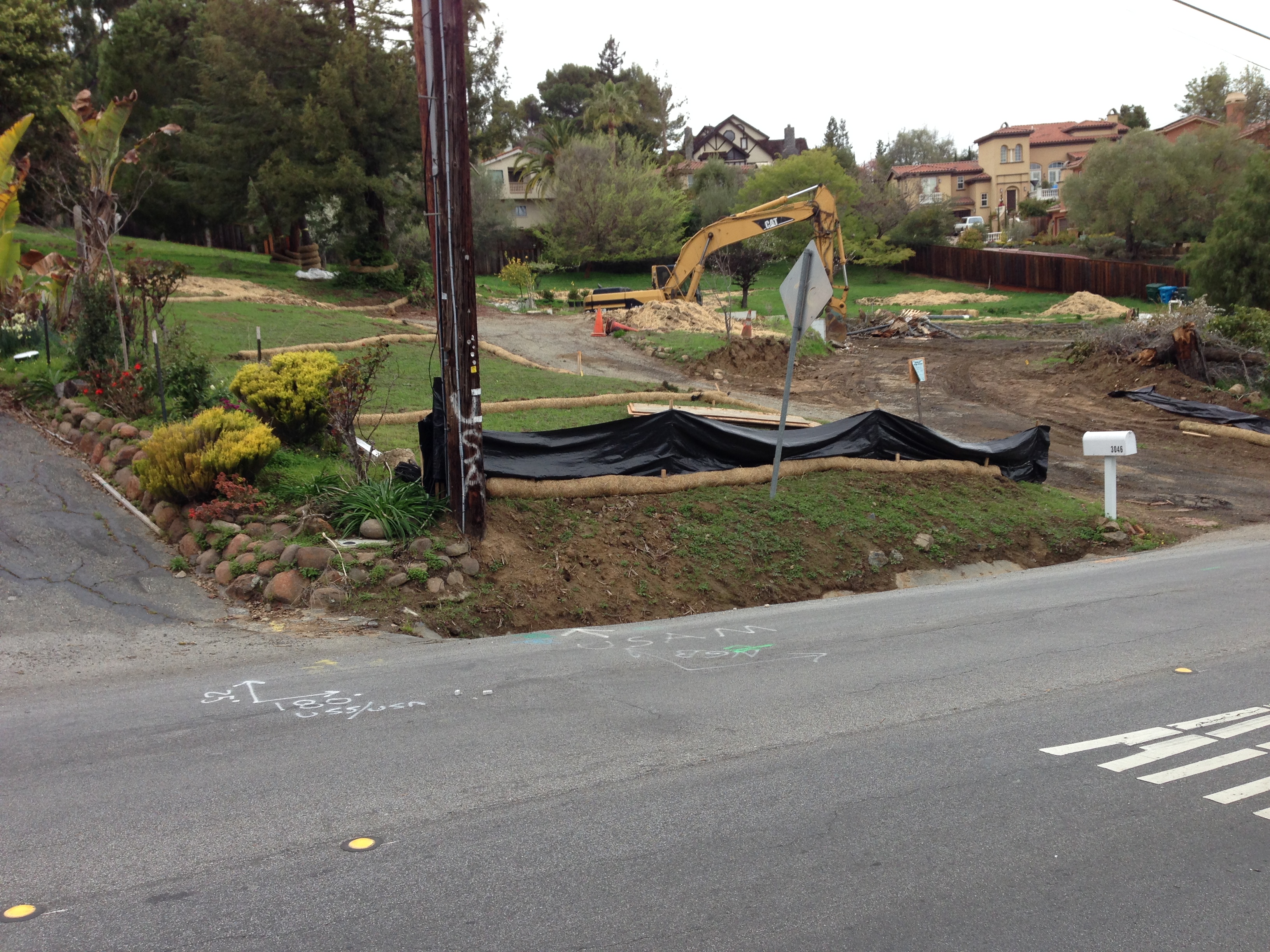 After one recent storm I was particularly eager to get some real exercise, so I headed up into the Emerald Hills area. My first stop was to check on the new development being built on Oak Knoll Dr., just across from where it first meets Upland Rd. (a distance of about six blocks above Alameda de las Pulgas). A number of years ago, my wife and I watched a small development—four large houses—go up right next door to where this new development is taking place. You may recognize that older development (only two of the houses are visible in this picture):