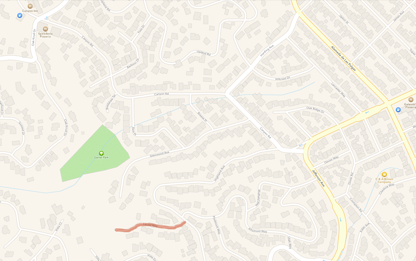 The road turning right in the above picture is Laurel Way (to the left is Altamont Way, which winds back towards Jefferson). Here’s a map showing its location (Laurel Way is the short squiggle near the bottom of the map highlighted in brownish-red):