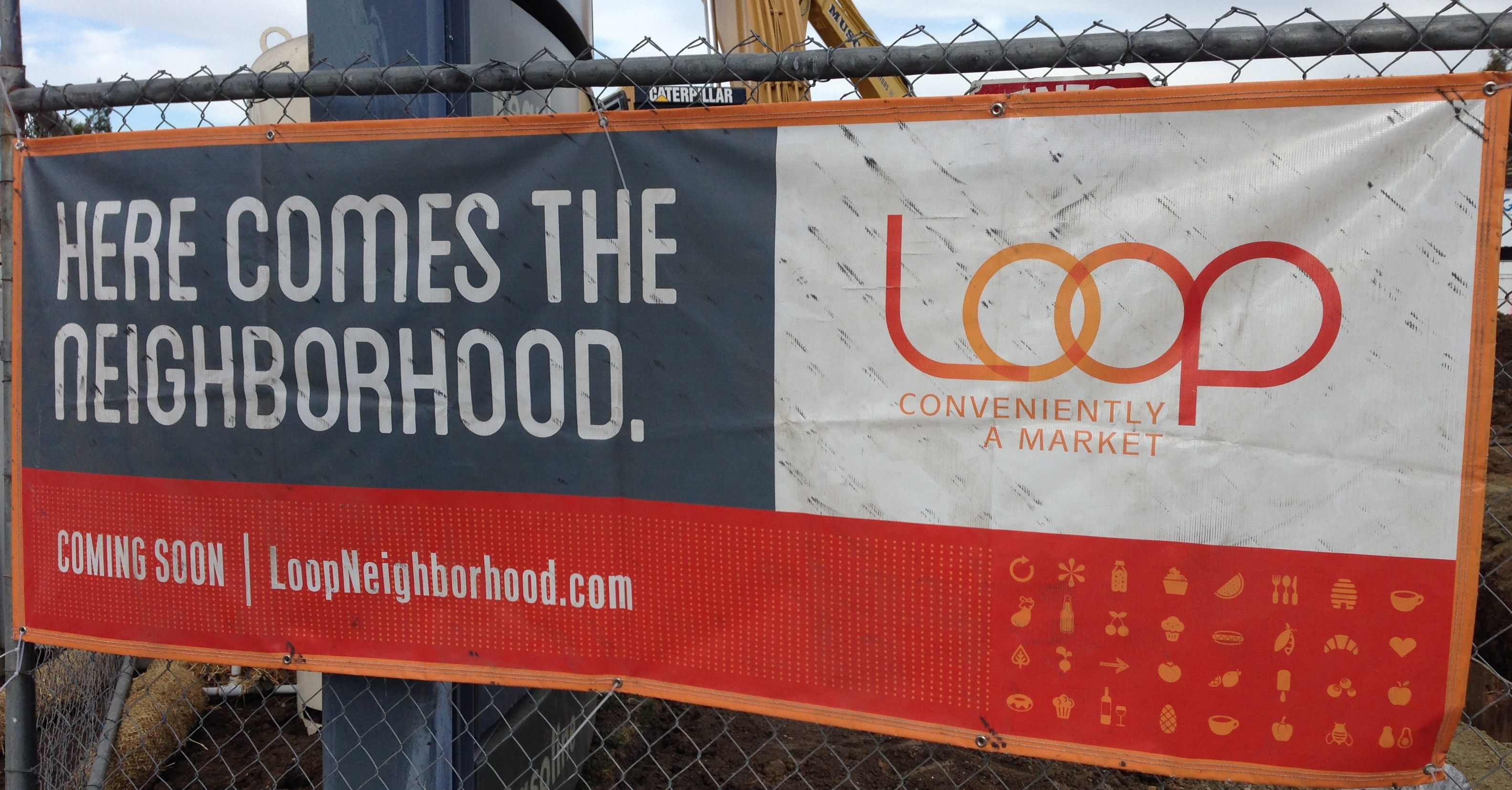 If you ignored the Shell sign you could logically conclude—as I originally did—that the Chavez Market was being converted to this “Loop” thing. But follow the URL on the fabric sign (http://www.loopneighborhood.com) and you’ll start to get an idea of what is actually going on. In short, they are rebuilding the Shell station to include a gas-station convenience store that is a cut above: one that you might actually buy real food (not just snacks) from, and one in which you may even sit down to eat. The’ve produced a concept video to help communicate the idea: click here to watch it.