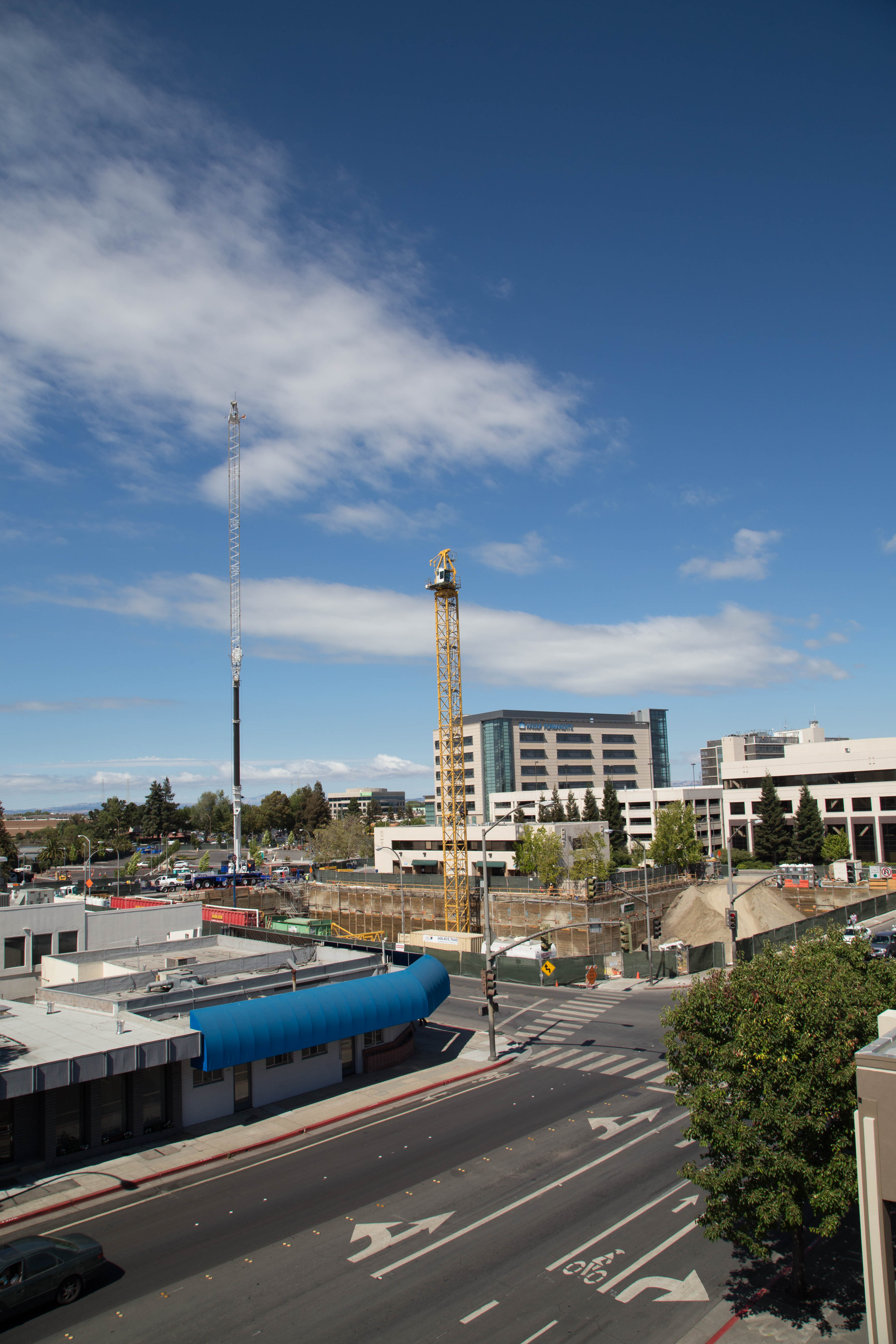 Of course, some items are too large to be carried in an elevator. And you do have to get the elevator itself installed. Thus, you will still need a mobile crane for some parts of the job. 201 Marshall was no exception. Earlier in its construction I took this photo, showing a pair of mobile cranes that may well have been installing the construction elevator:
