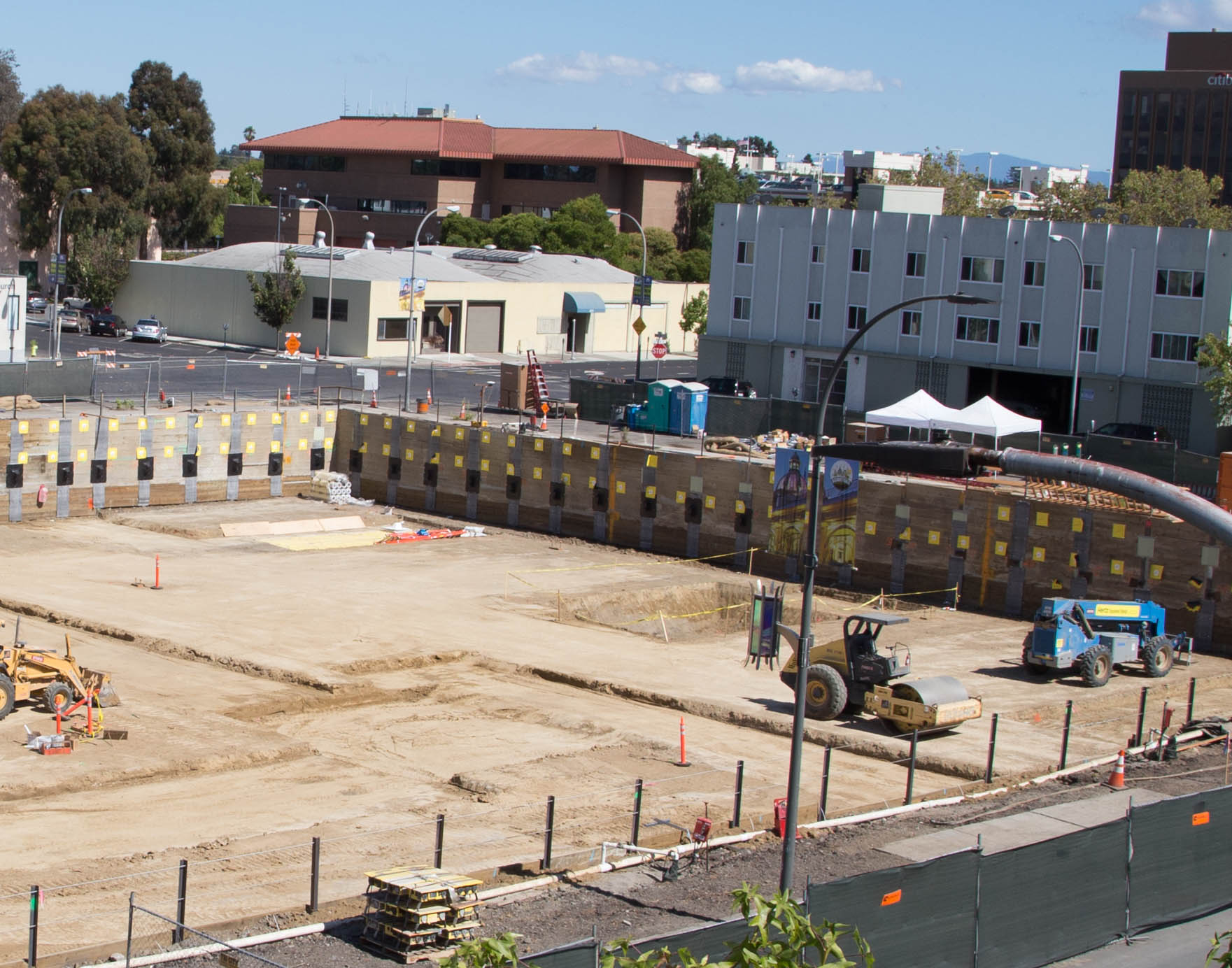 Nearby (at 525 Middlefield) excavation is well underway for the Indigo project. This one will be the largest of the current residential projects: three 10-story towers containing a total of 471 apartments. Although their cranes have yet to arrive (and a project this size is likely to require more than one), I believe that the large square hole at the center of the following photo is probably for the base of a crane. Given that this hole is at one end (near Bradford St.) of a long rectangular-ish project, I would guess that there will be a second crane located at the other end of the property near Veteran’s Blvd. But that end of the property is still being worked over by tractors and bulldozers, so we’ll have to wait to have that guess confirmed.