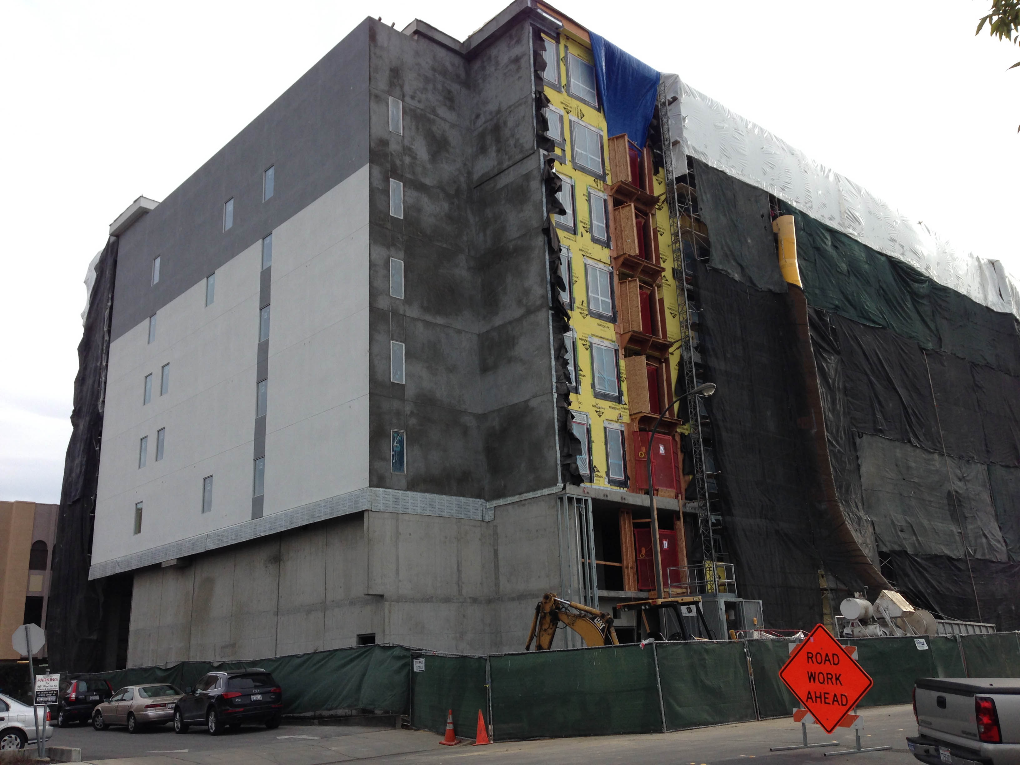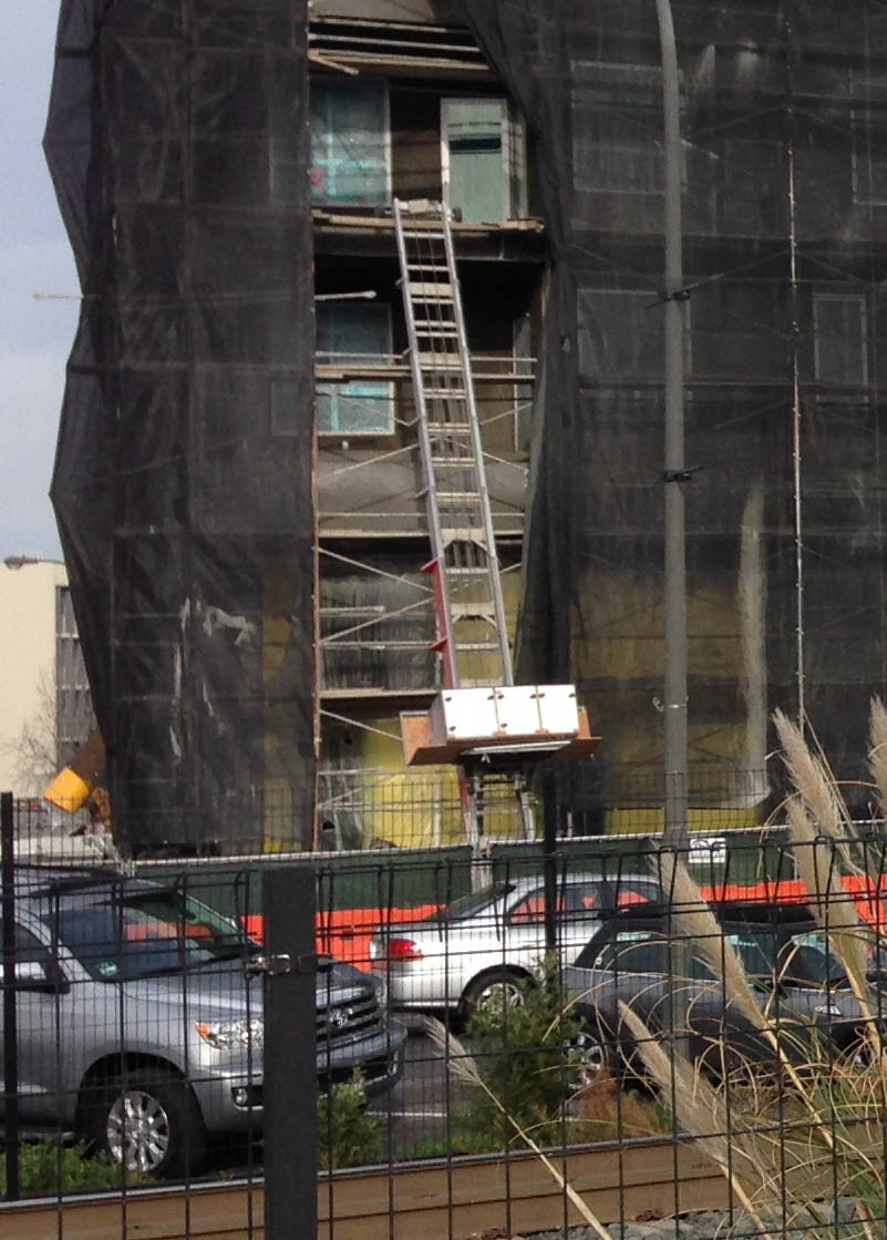 201 Marshall, now complete, also employed a construction elevator during the building process. In the following photo [click it to see a larger photo] the framework along which the elevator cab rides is a little hard to see, since it extends no higher than the top floor of the building. But the grey elevator cab can just be seen behind the green construction fence just to the left of the orange “Road Work Ahead” sign. And the red safety doors on the upper parking level and the first residential level are pretty easy to spot.