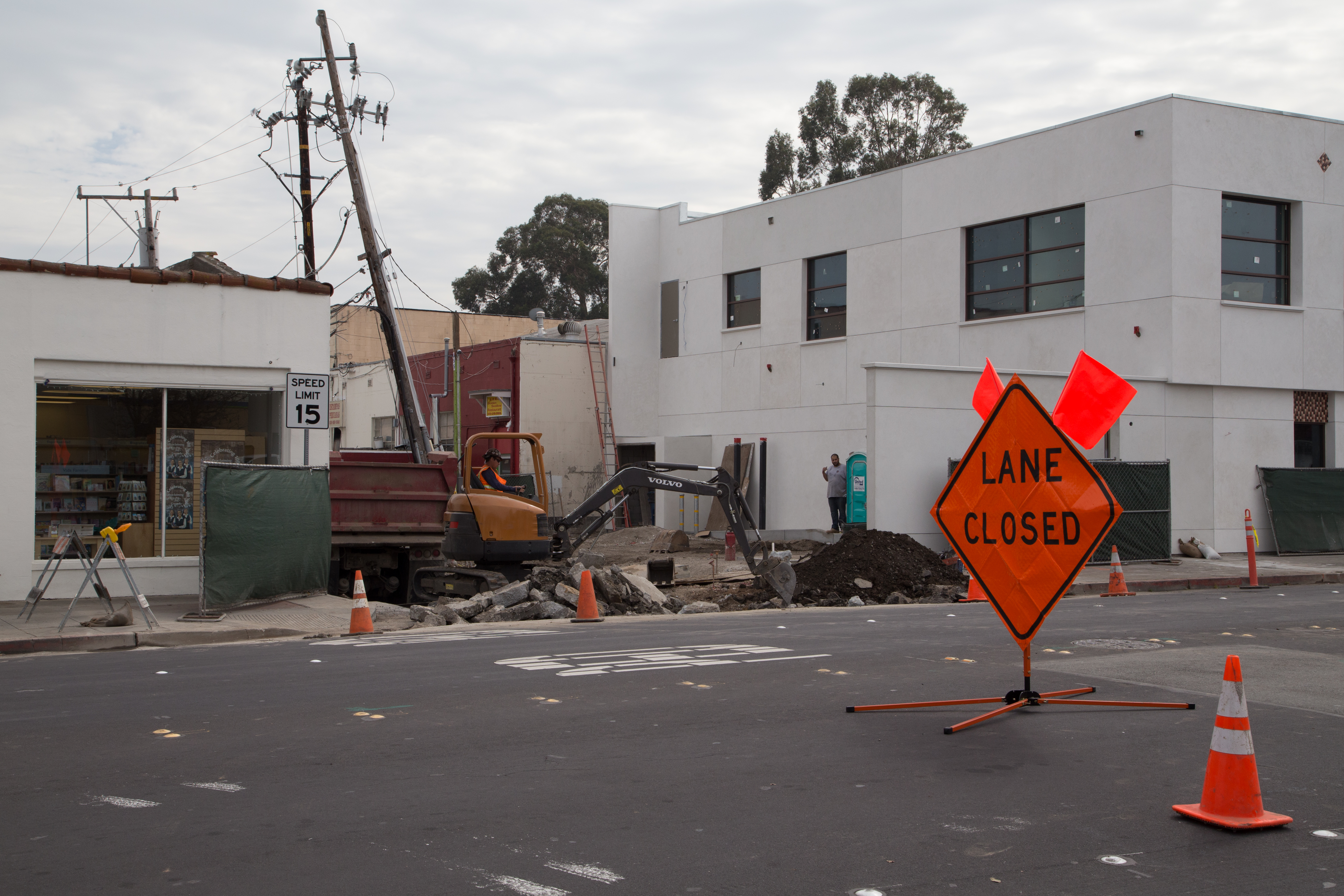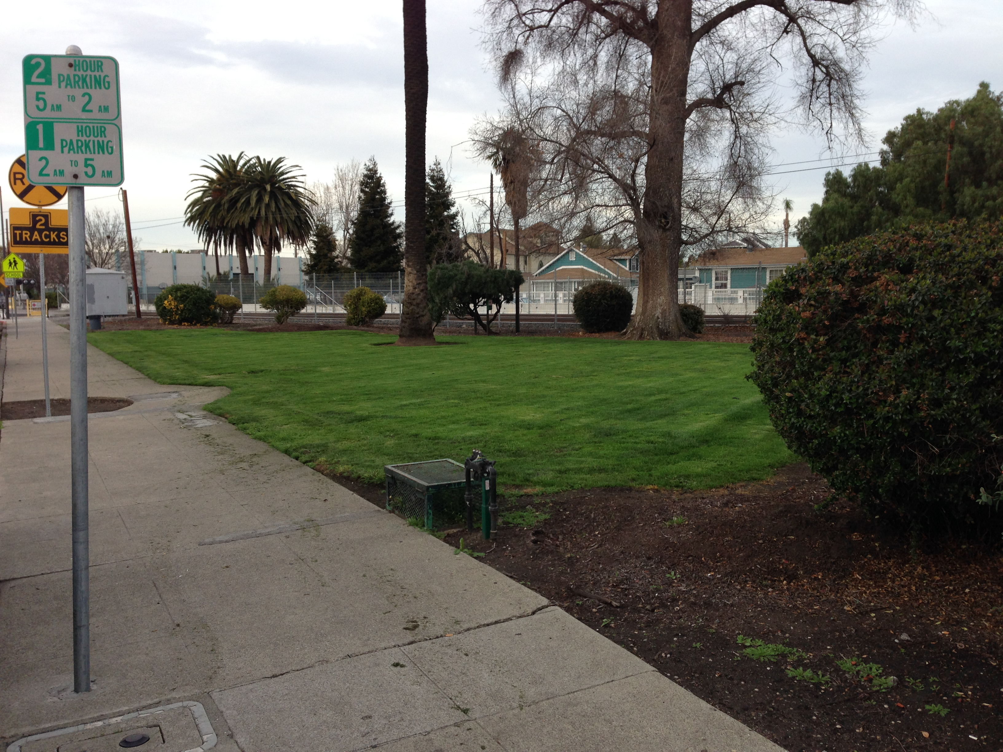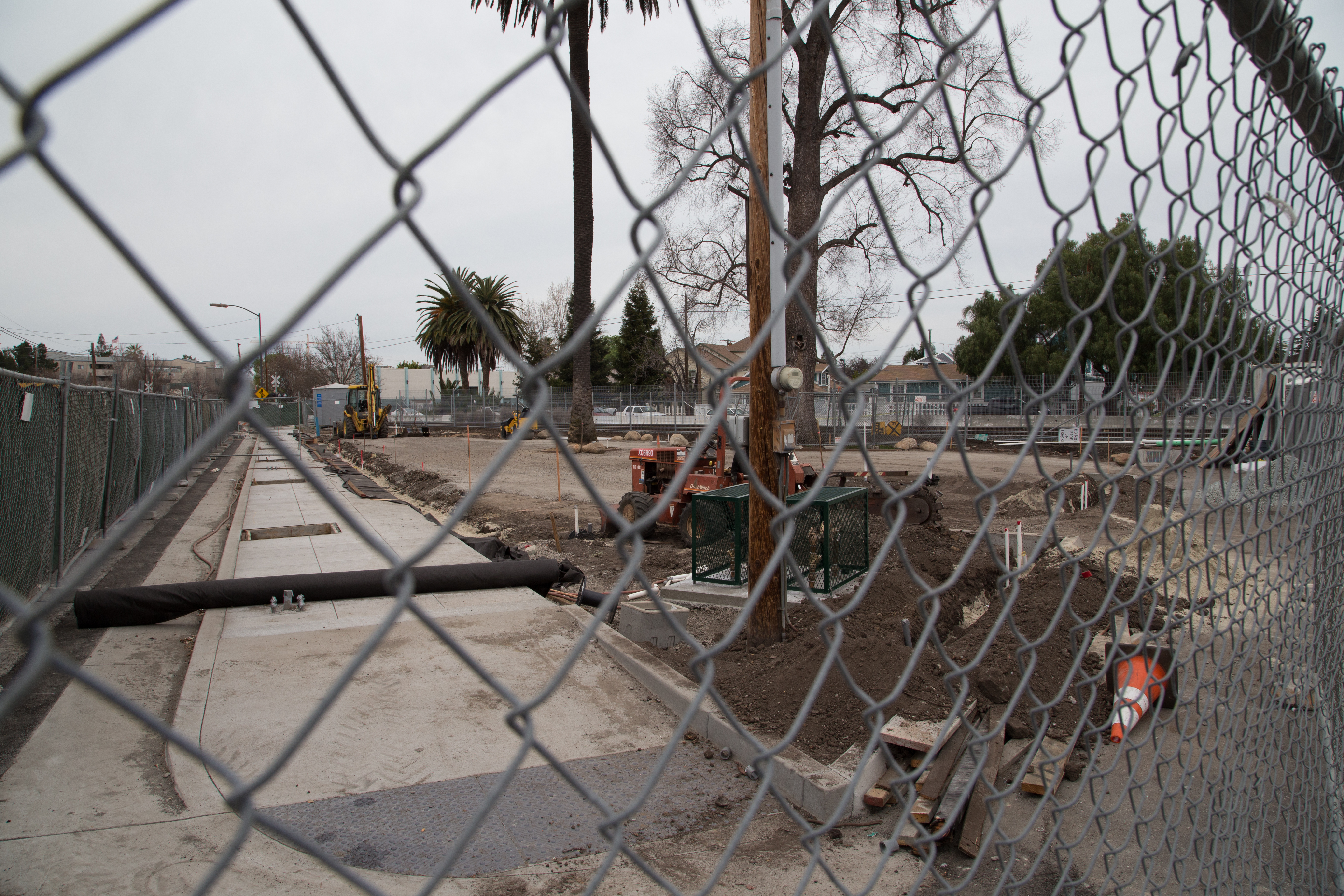 Heading down Franklin, I took an opportunity to get some pictures of Elan Redwood City receiving its outer skin. I’ll have more to say on that project and its offspring in a future post, though. For now, a quick zig-zag along Maple, Lathrop, and Elm led me to the corner where Elm Street dead-ends into Main, near the aptly named Main & Elm (the former Main Street Coffee Roasting Company). The Main Street Dog Agility Park is being constructed here, on a small triangular-shaped parcel situated between Main St. and the railroad tracks.