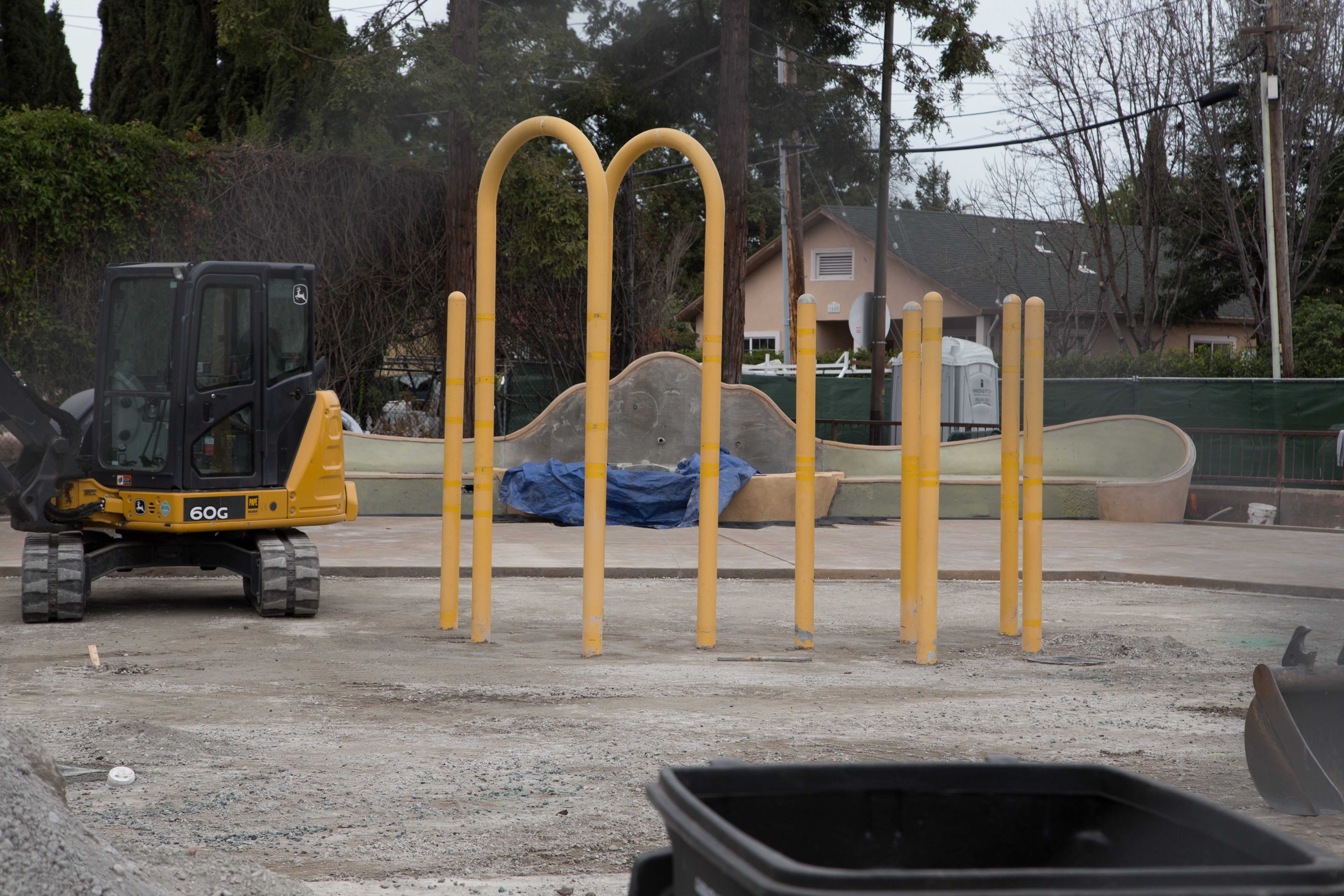 Just a few blocks away, at the corner of Chestnut St. and Middlefield Rd., sits Jardin de Niños, a more conventional neighborhood park. After holding two community workshops back in 2011, a new design for this long-standing park emerged. As with the Dog Park, Jardin de Niños is well on its way to completion, with new play equipment, a new restroom, new lighting, and a rather interesting Bird Bath Fountain/seat wall in one corner:
