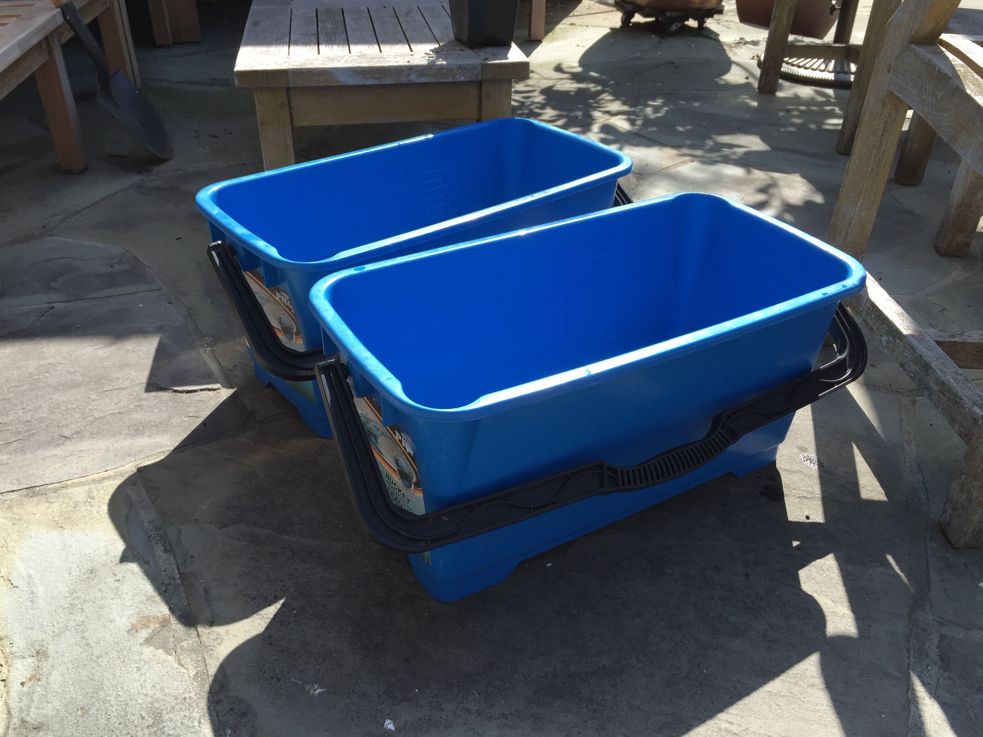 My wife and I have already moved to the “bucket in the shower” phase: to the benefit of our outdoor potted plants we bought these two 6-gallon water buckets from Home Depot and use them to capture the warm-up water from our shower: