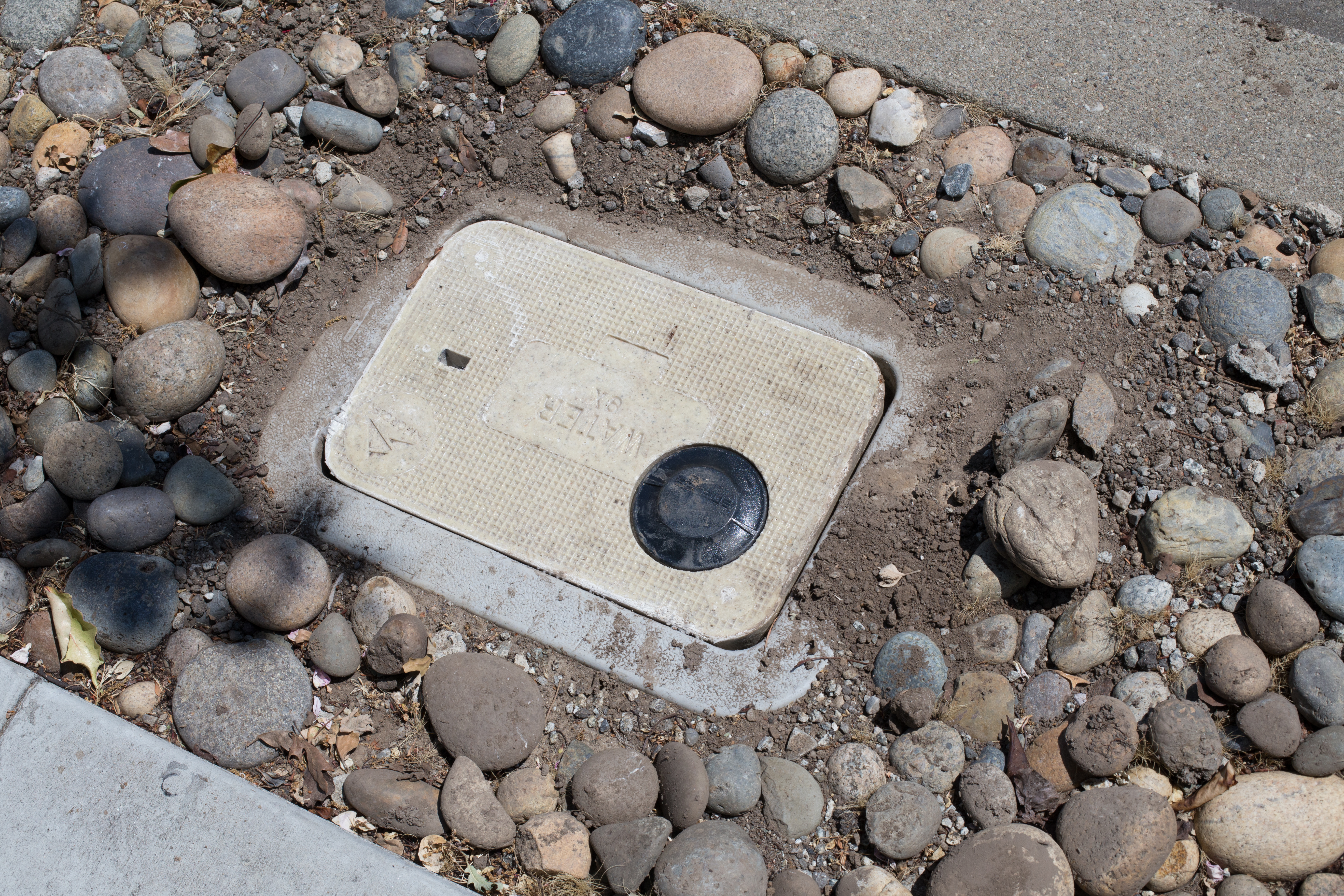 So just how do you read your meter? It’s actually pretty easy. First, you need to locate it. You’ll find it somewhere between your main shutoff (you do know where the shutoff is, don’t you?) and the street. Generally, it’ll be close to the street, to make the meter-reader’s job easier. In our case, it is located in the parking strip in front of our house, in an appropriately labeled box: