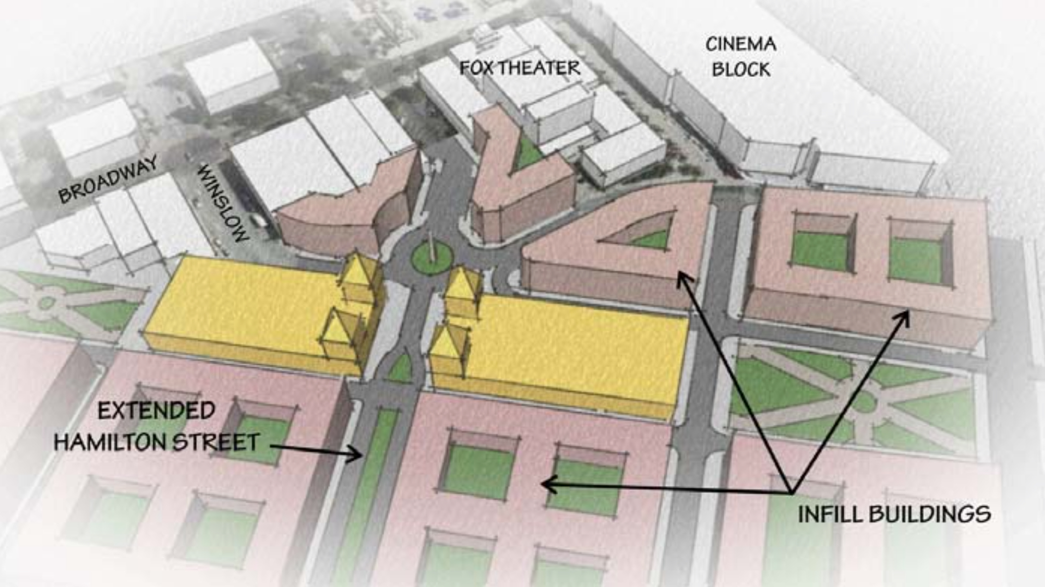 a new plaza that would provide new and improved public space in the Downtown, enhance the connections between Sequoia Station and the Downtown, support the development of new office and retail on Block 2, and provide a strong visual terminus to Hamilton Street.