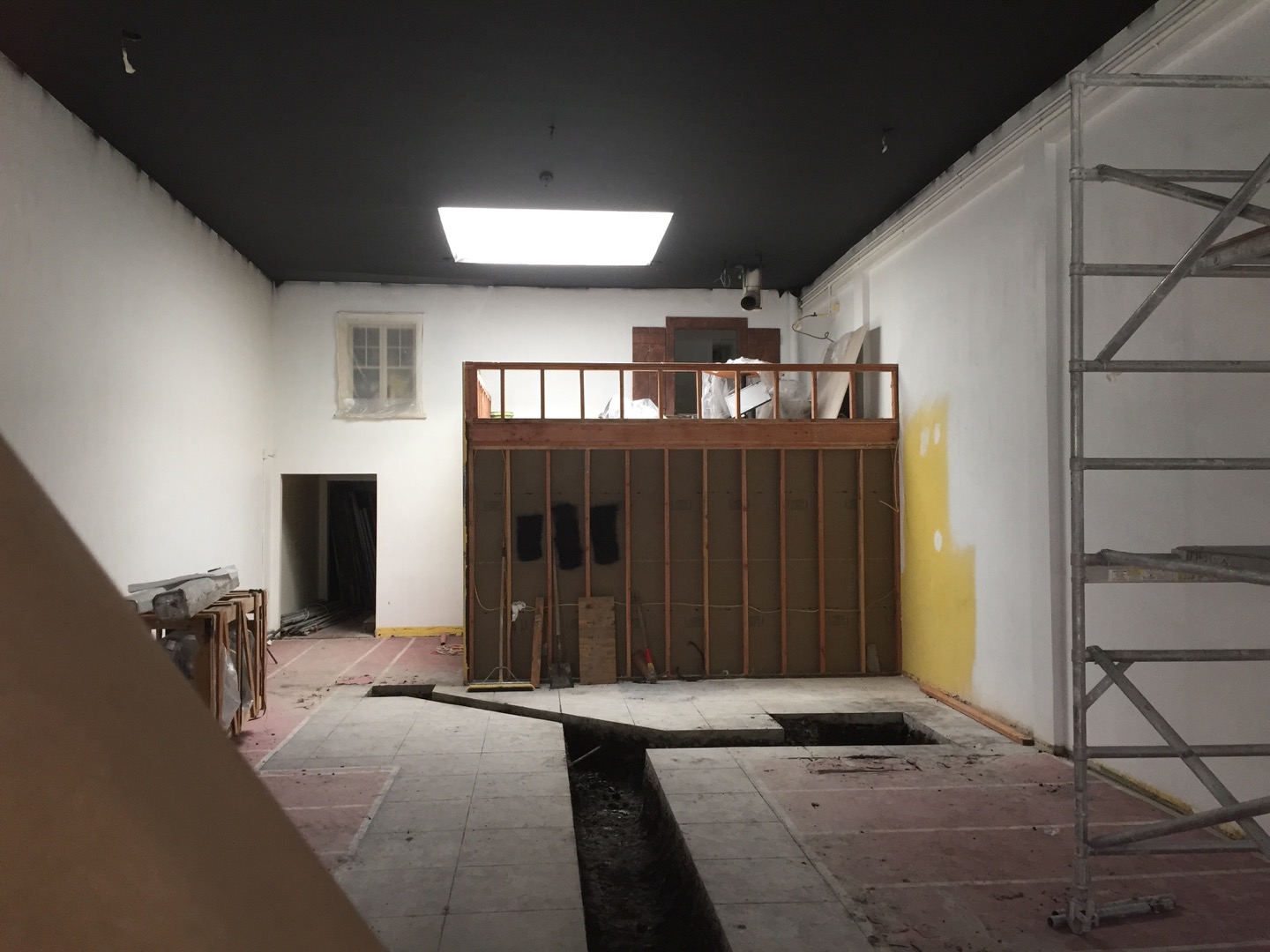 Over on Main Street, I checked in on The Striped Pig. I still don’t know a whole lot about what this will be, other than that they will serve alcohol. But I took advantage of a hole in their temporary window coverings to take this shot, which clearly shows that they are in the thick of construction: