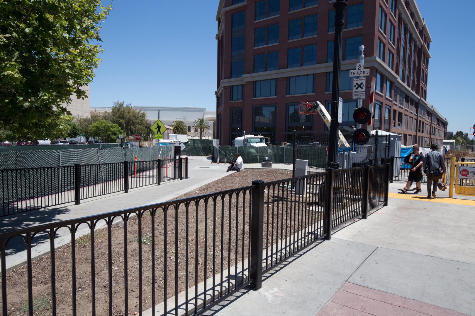 Now that was a vision. One that faded away, unfortunately, when the city agreed to allow the construction of Crossing/900. I’m somewhat pleased, however, to report that the basic idea for a grander entrance to the city didn’t entirely go away: Depot Circle disappeared from the Precise Plan, but something new, dubbed North Plaza, appeared and is now under construction. Although not nearly as ambitious, it has some of the same aims. Triangular in shape, North Plaza will be located on north side of the Crossing/900 buildings, in a space which up until now consisted of a rather wide sidewalk, a ramp to the Caltrain platform, and a large triangular planter: