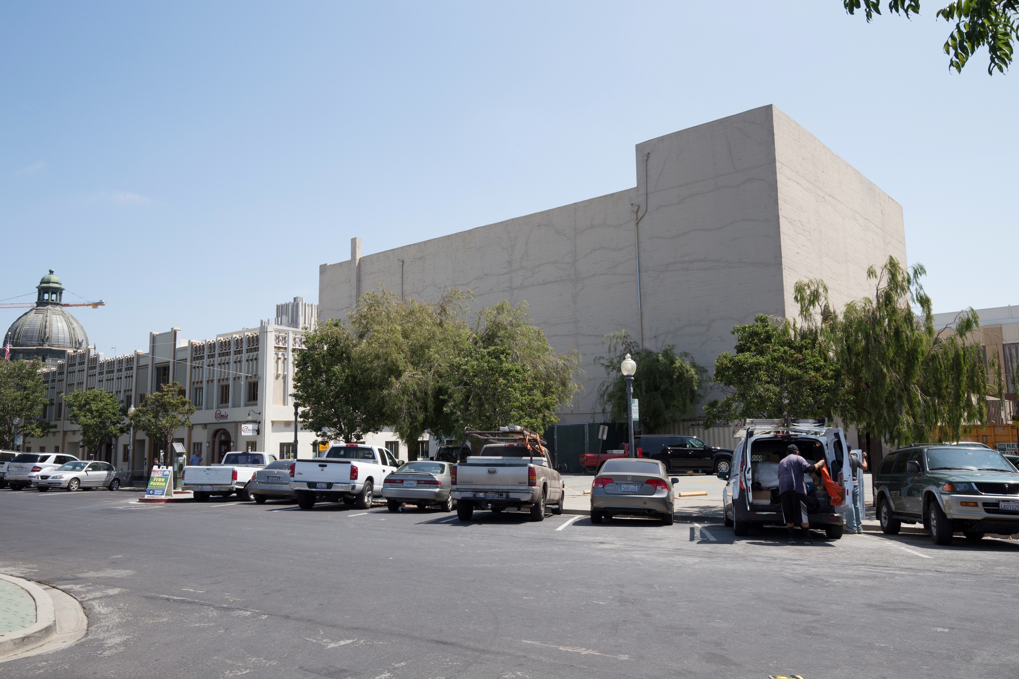 The following photo shows another angle on where the building will sit, with Hamilton Street in the foreground. The new building will consume the entire parking lot beyond the visible row of cars, from just this side of the building on the left (that’s Amie Wine Bar & Restaurant, for those who know it), making an “L” to wrap around the Fox Theatre, and extending all the way to Theatre Way: