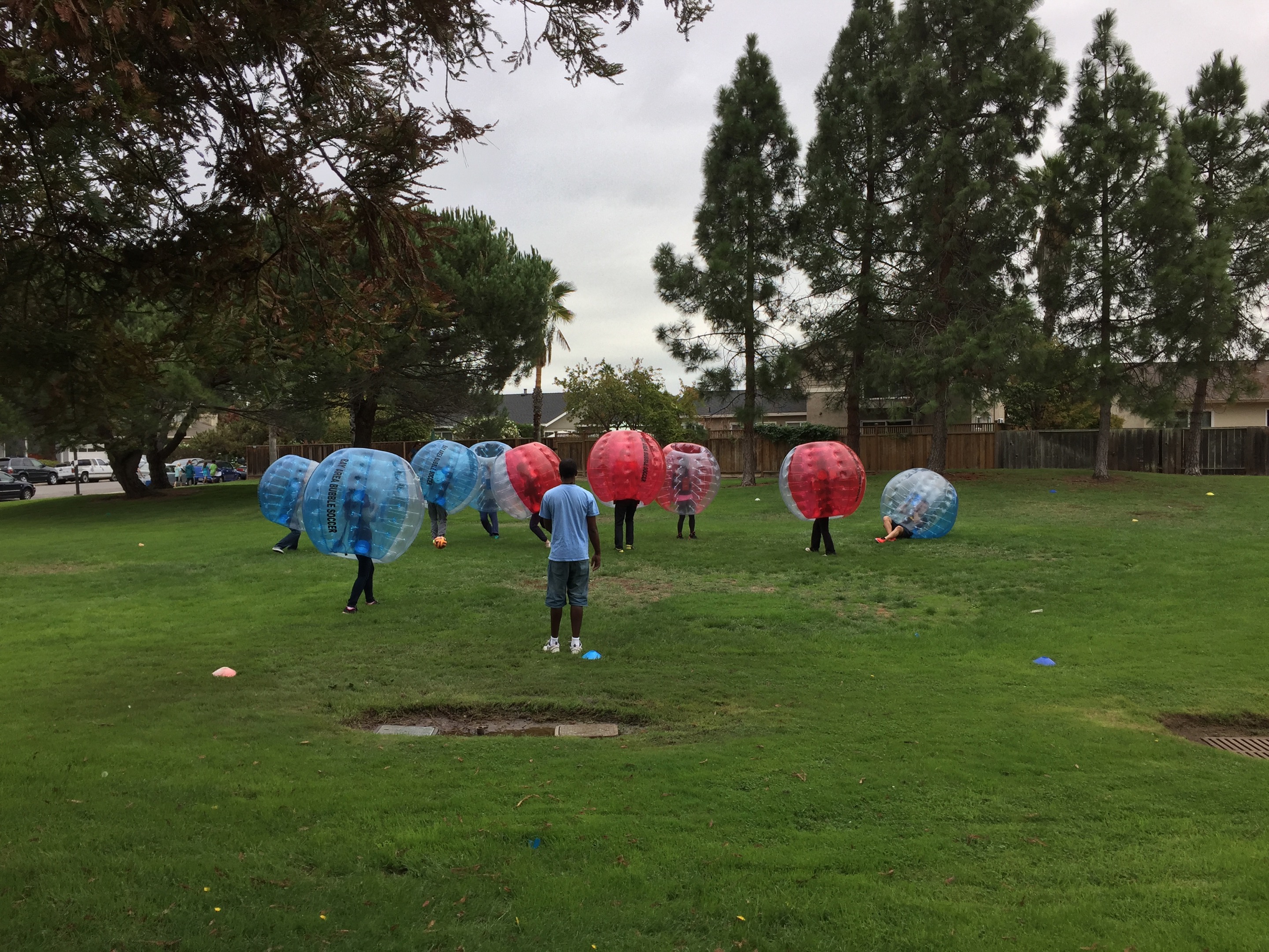 They’re playing a game called “Bubble Soccer” from a Fremont company called, naturally, “Bay Area Bubble Soccer.” For a fee the company supplies the bubble suits, the goals, and the referee. Apparently you play by normal soccer rules, scoring points by kicking the ball into the appropriate goal (not visible in the above picture). The bubble suits protect the players and help ensure that hilarity ensues. And indeed, there was plenty of laughter and much crashing about, resulting in a lot of people falling over. It was odd to watch, but looked like a lot of fun to play.