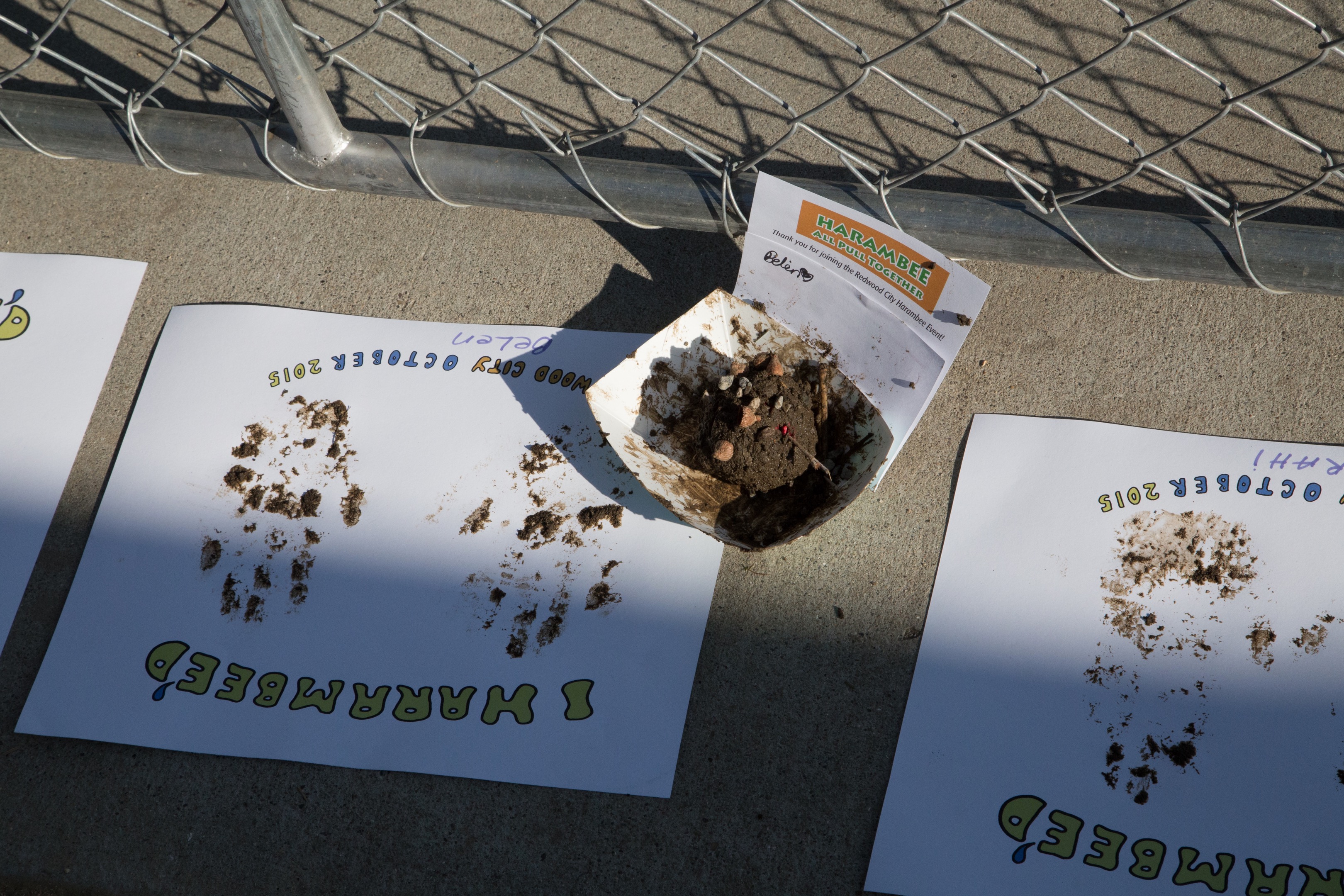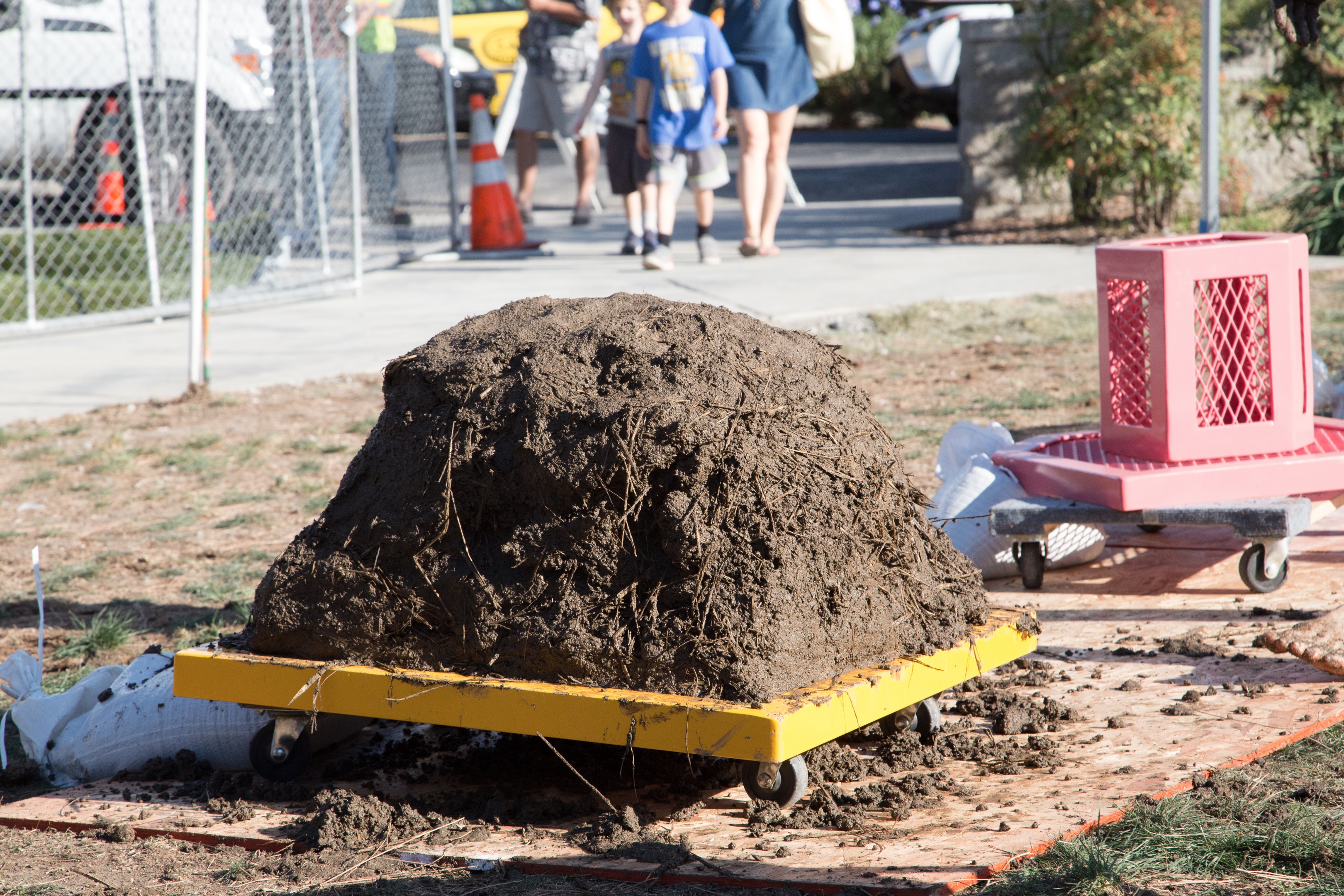Because only so many people could stomp in the mud, the project organizers had thoughtfully set up other activities. Kids could create and decorate adobe balls, and could create adobe handprints on sheets of paper. It was gratifying to see kids running, laughing, and playing in the mud—with nary a cellphone or tablet in sight (except for those being used as cameras, of course). The City, along with their partners Fung Collaboratives, the Parks and Arts Foundation, and Michael Koliner (the artist), are to be commended for showing kids the joy of creating physical objects such as these adobe benches.
