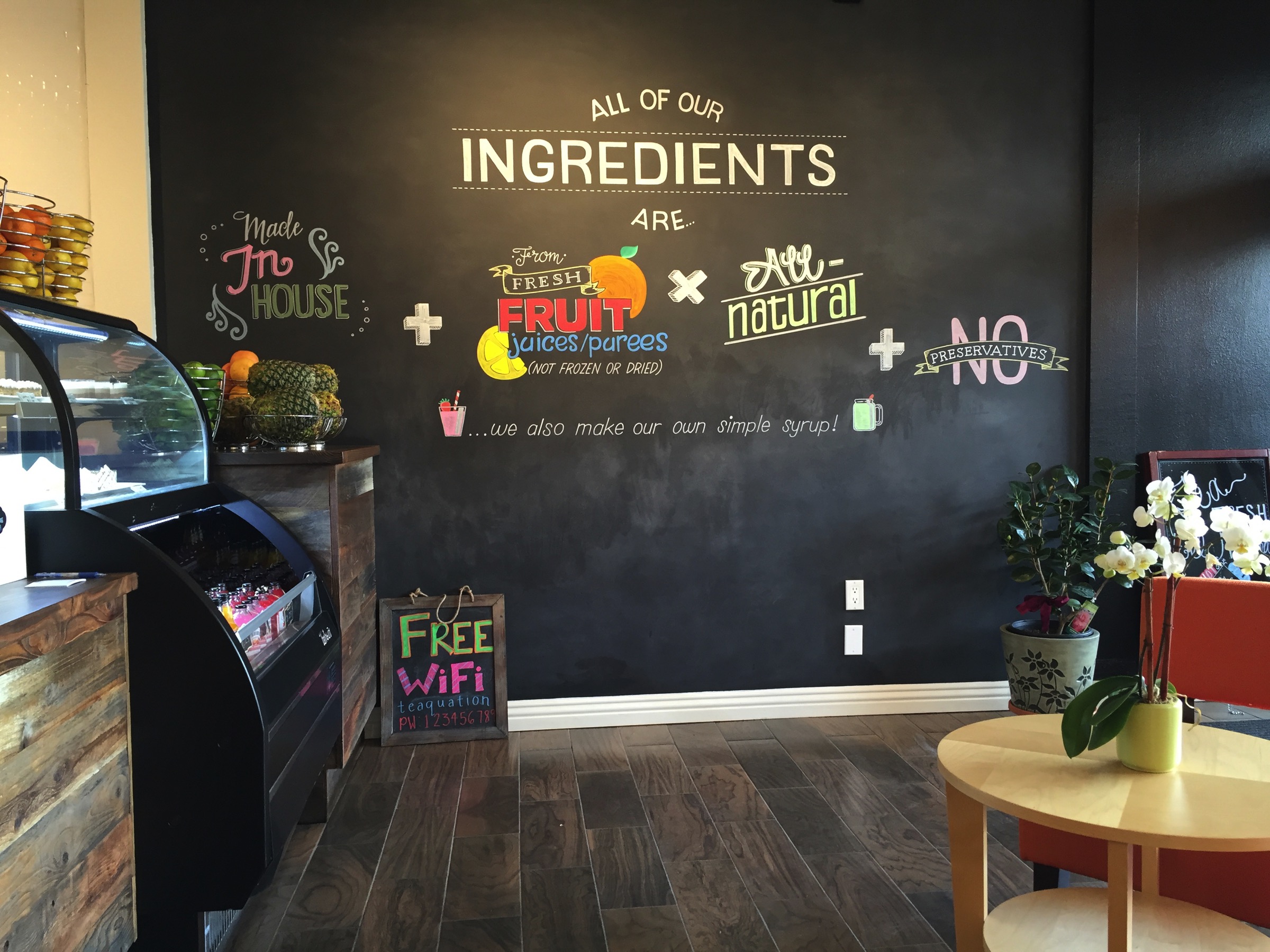 Teaquation also has a case with a number of pre-made food items, so you’ll be able to get something to eat to go with your drink. And if you aren’t in the mood for a fruit tea, they do serve coffee (Americano, Cafe Latte, and Espresso). The atmosphere is clean and modern, with judicious applications of barn wood. I felt very comfortable sitting there and plan to go back and take advantage of their free WiFi as I try another fruit/tea cocktail. For the pedestrian they are easy to get to; for drivers it is a little trickier. Unfortunately the adjacent parking lot does not appear to be for the use of Teaquation customers. You’ll need to park on El Camino Real, or on James, or possibly on Harrison. But I strongly encourage you to make the effort, at least once, and check them out. I think you’ll like what you find.