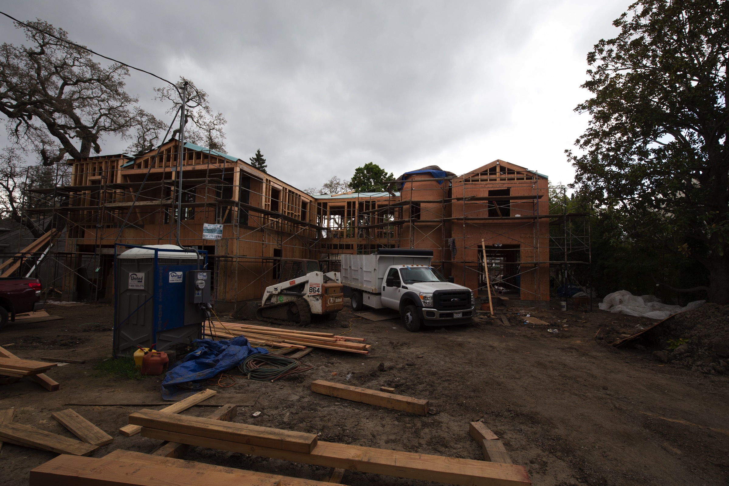 I began Wednesday’s walk by heading down Edgewood Road just to see how the “tower house” was doing. I first wrote about this house in Good Fences Make Good Neighbors, and have been following its progress ever since. The contractor seems to be moving right along: the framing appears to be complete, and the house is nearly ready for roof tiles—I assume that they won’t use shingles on this style of home—and windows. I was pleased to note that the round tower is still very much present and visible (behind the white truck, in this image):