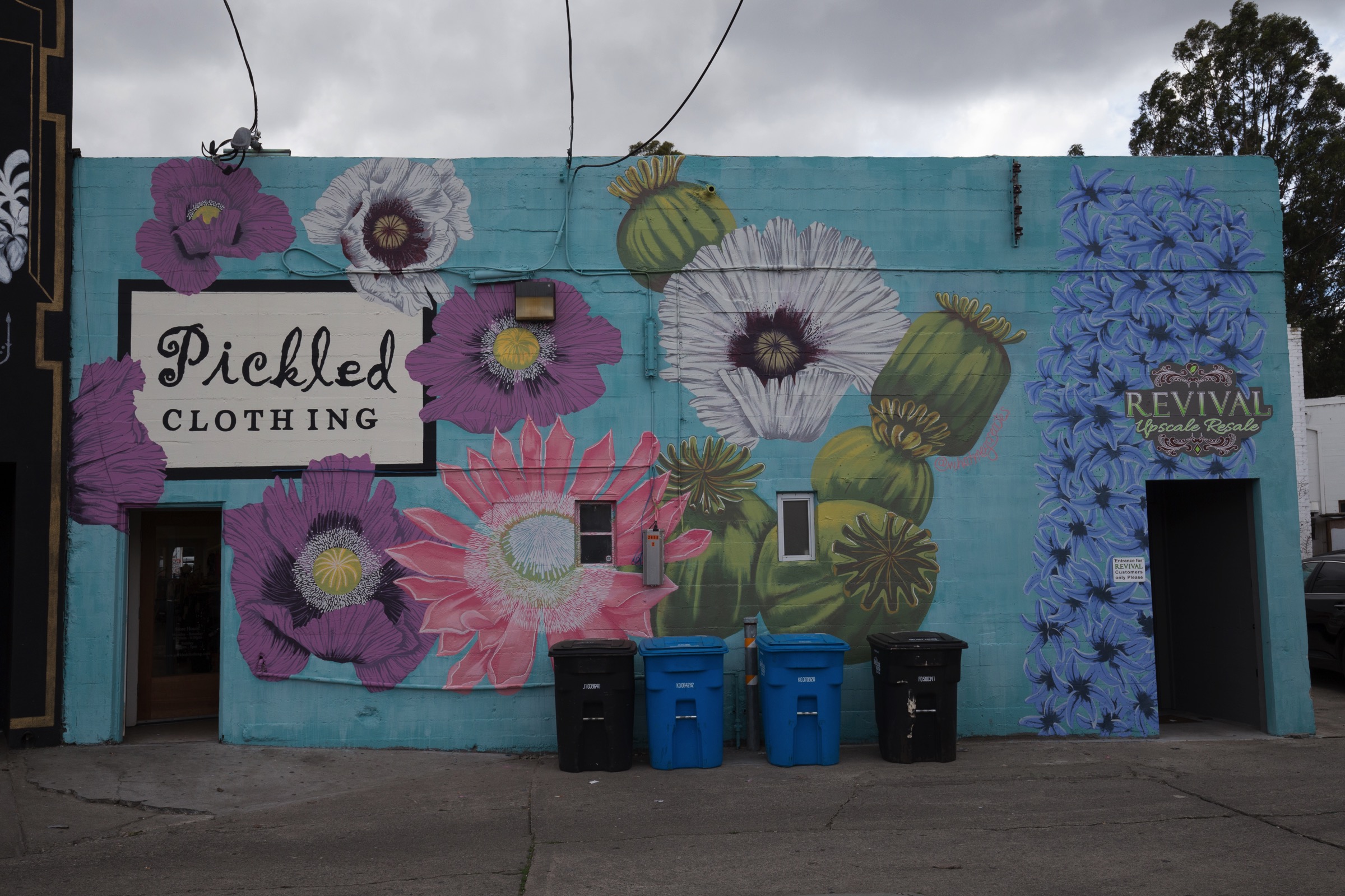 Next up were the Perry Street parking lot murals. I had heard that they were now done, and wanted to see how they look in their final form. Since I last saw them, the floral mural has picked up some extra blooms: