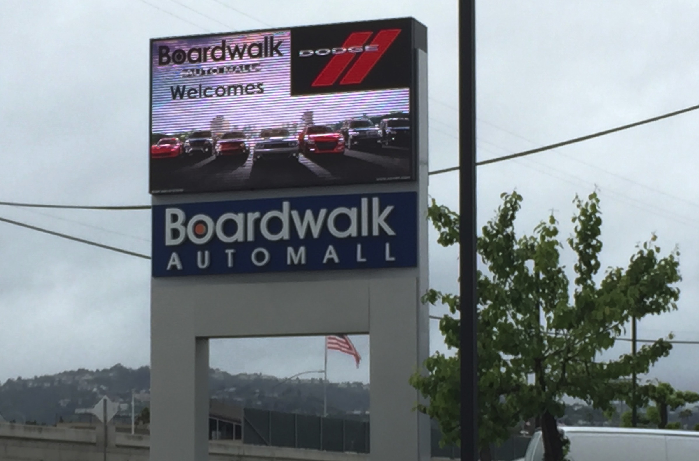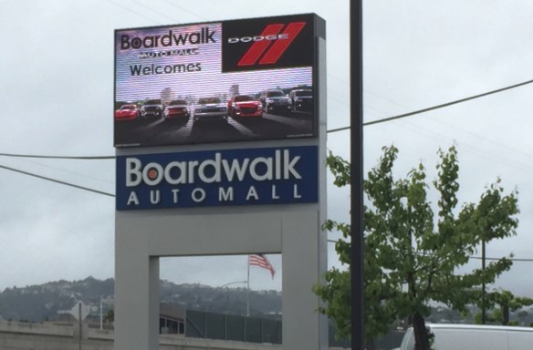 At the time I took this picture there were no physical signs on the building’s exterior advertising the new operation, but when I peeked inside I could see a prominent sign for each of the four brands. And then, there are the couple of dozen new Chrysler and Jeep vehicles on display in front of the building. And finally, Boardwalk’s electronic sign is periodically welcoming the new brands: