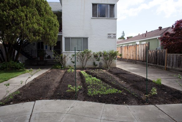Greg, Thank you for mentioning my garden on Duane Street, In my case the property is family owned and I only need my Aunt and Mother’s blessing to make improvements. During the drought I stopped watering what was once a lawn and the soil became as hard as the Sonorian desert. When the rains finally came this winter the land became workable. When I began turning the soil a neighbor suggested a community garden. Not only does it save water as opposed to a lawn it has also evolved provoked a lot of interest, pride and conversation. In the center wedge-shaped beds are arugula, broccoli rabe, spinach, mustard greens, butter lettuce and cabbage. Zucchini, tomatoes, potatoes, peppers in other beds are now sprouting from seed with basil and other veggies on the way. Being as the property is located across the street from a school with heavy pedestrian traffic I decided to make of perimeter fence out of grapevines (merlot, flame and niagara grapes) which I am training with trellises made with the poles and twine. Thanks again for your observation and comments. Loved your article on the water tanks of Emerald hills btw.