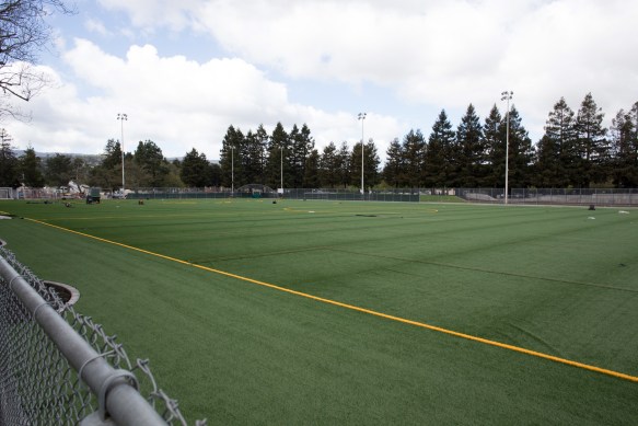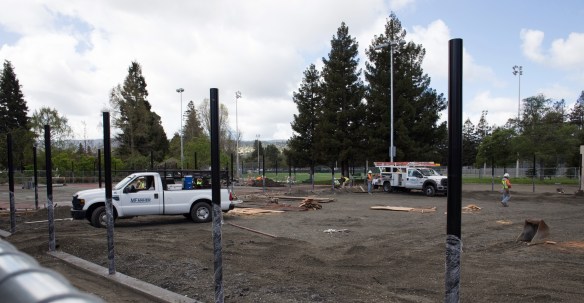 I found the above house while I was checking out the current status of Red Morton Park. Redwood City’s 30+ parks are an ideal resource, particularly for those who have taken out their lawns but still occasionally need some open space in which their kids can play. Since the beginning of the year the city has been actively working to replace the artificial turf on three of the sports fields at Red Morton, as well as redoing the tennis courts. El Niño has interfered somewhat, causing things to go more slowly than the city would have liked, but my visit there earlier this week showed me that the contractors are taking advantage of every opportunity to get work done—and that they appear to be in the final stretch. For instance, Griffin Field is getting its turf installed, and should be ready for use in a couple of weeks: