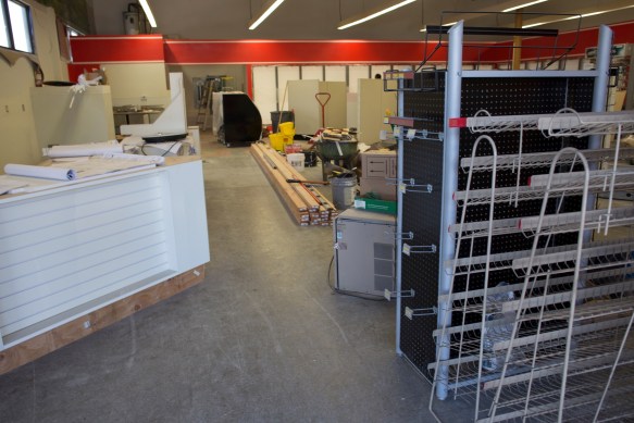 The red banding over the refrigerators (which cover most of the back wall and the entirety of the right-hand wall) make me think that there may be a particular brand involved, although a specific one doesn’t immediately spring to mind. Does this place look familiar to anyone? The counter on the left just has to be the checkout counter, and I assume that once the floors are cleared there will be a couple of grocery aisles in the center. It’s getting close! I’ll keep checking in on this place, and will keep you posted on any interesting developments.