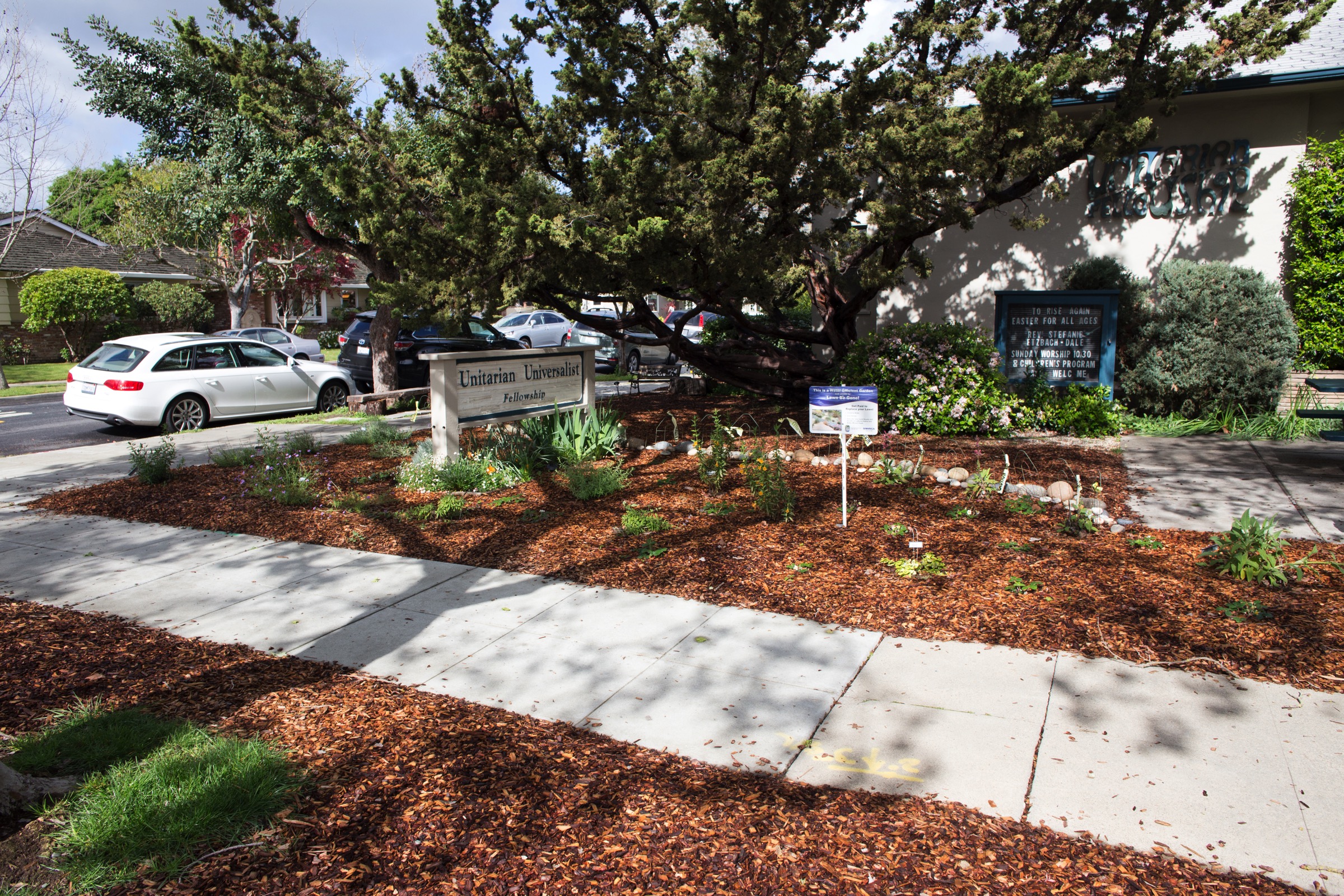 As I walk around I’m seeing more and more places where people have ditched their lawns. Many are taking advantage of the Lawn Be Gone program to get reimbursed for replacing their lawns with drought-tolerant landscaping (in Redwood City, the program pays $1 per square foot—but be aware that you have to follow their requirements pretty carefully). I’m particularly pleased when larger organizations, such as churches, get in on the action. As did our own Unitarian Universalist Fellowship, at the corner of Brewster Avenue and Lowell Street: