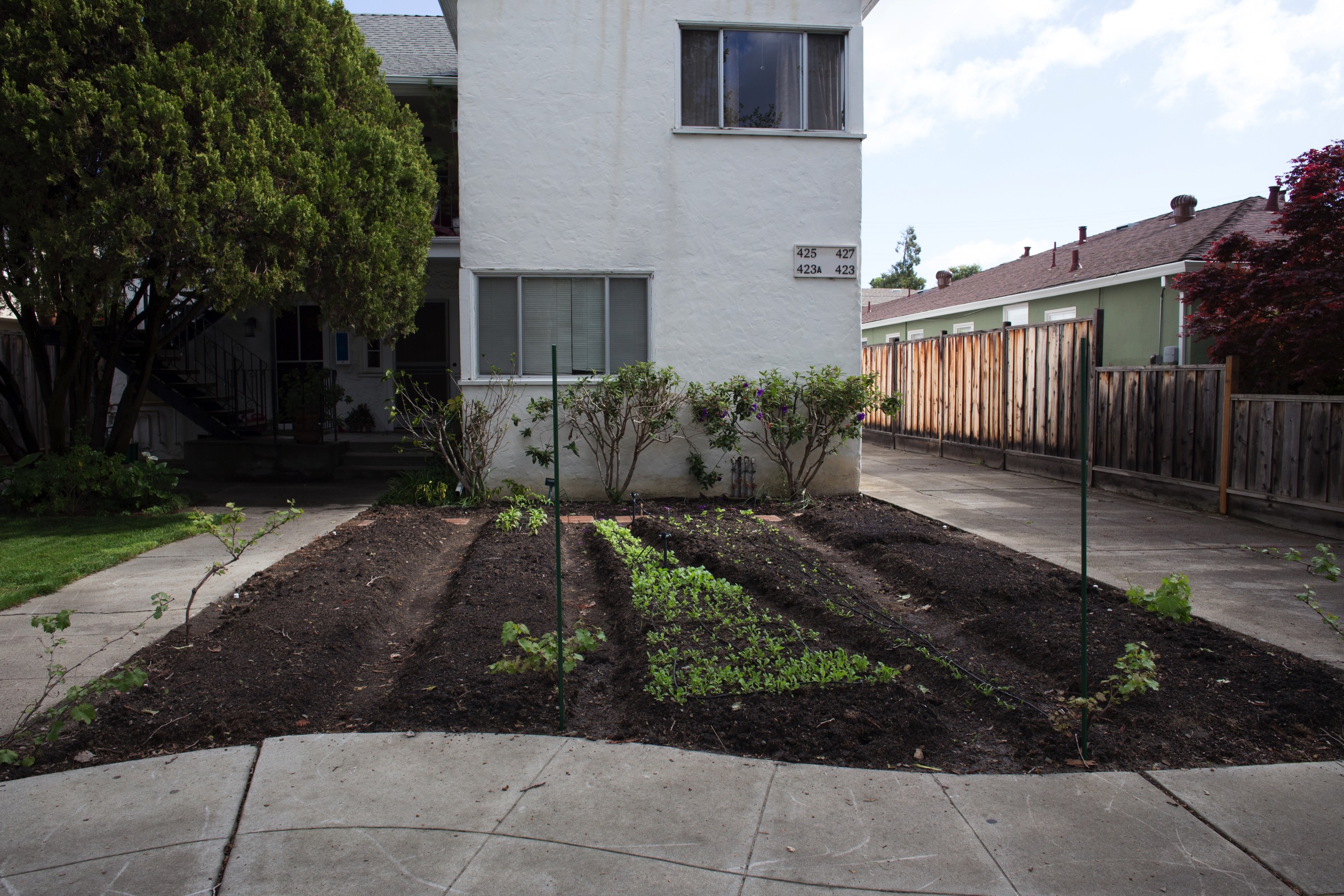 Greg, Thank you for mentioning my garden on Duane Street, In my case the property is family owned and I only need my Aunt and Mother’s blessing to make improvements. During the drought I stopped watering what was once a lawn and the soil became as hard as the Sonorian desert. When the rains finally came this winter the land became workable. When I began turning the soil a neighbor suggested a community garden. Not only does it save water as opposed to a lawn it has also evolved provoked a lot of interest, pride and conversation. In the center wedge-shaped beds are arugula, broccoli rabe, spinach, mustard greens, butter lettuce and cabbage. Zucchini, tomatoes, potatoes, peppers in other beds are now sprouting from seed with basil and other veggies on the way. Being as the property is located across the street from a school with heavy pedestrian traffic I decided to make of perimeter fence out of grapevines (merlot, flame and niagara grapes) which I am training with trellises made with the poles and twine. Thanks again for your observation and comments. Loved your article on the water tanks of Emerald hills btw.
