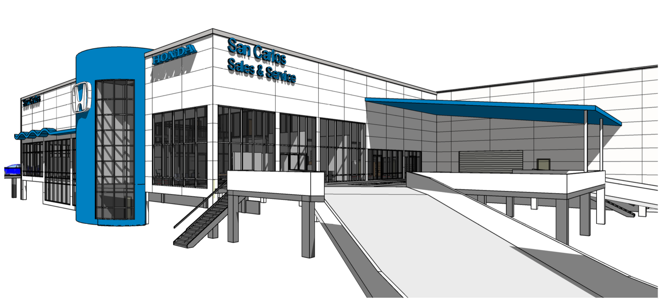 As the stairs and ramps indicate, the two-story Honda San Carlos building will be placed on stilts above a surface parking lot that will house the dealership’s inventory. Within the building you’ll find both sales and service: to have your car worked on you’ll drive it up a ramp.