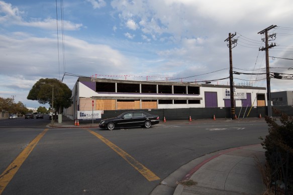 Of course, while recycling a whole building is great, “reuse” is even better. I occasionally walk down Broadway beyond Woodside Road, and over the past nine months or so watched the transformation of the huge two-story slab-sided concrete building at 899 Broadway (at the corner of Broadway Street and Charter Street). Here is a picture of the building early on in the construction phase, not too long after the windows were stripped from it: