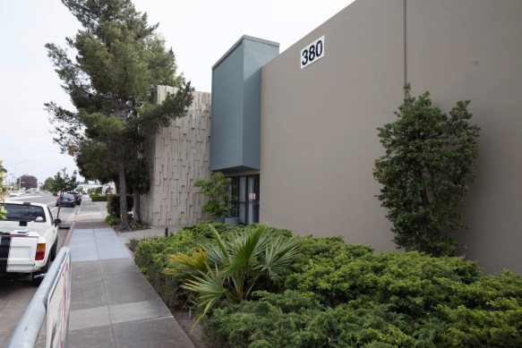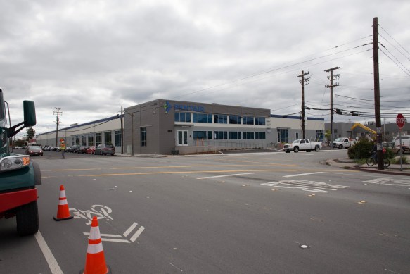 Most recently this building was the home of Metro Auto+Body, an automobile body shop, although from the shape of the building and the number of large roll-up doors on both Charter Street and on Broadway it seems to have been originally built as a warehouse. Regardless, W. L. Butler, a Redwood City-based construction firm, has transformed the building for its new tenant, Pentair Thermal Management. Pentair Thermal is a “full service designer and integrator of optimized heat management systems”: they offer “quality products and service solutions for floor heating, fire and performance wiring, leak detection, sensing, and snow melting & de-icing for industrial, commercial and residential applications.” Construction is now complete, and the reused building truly has been transformed: