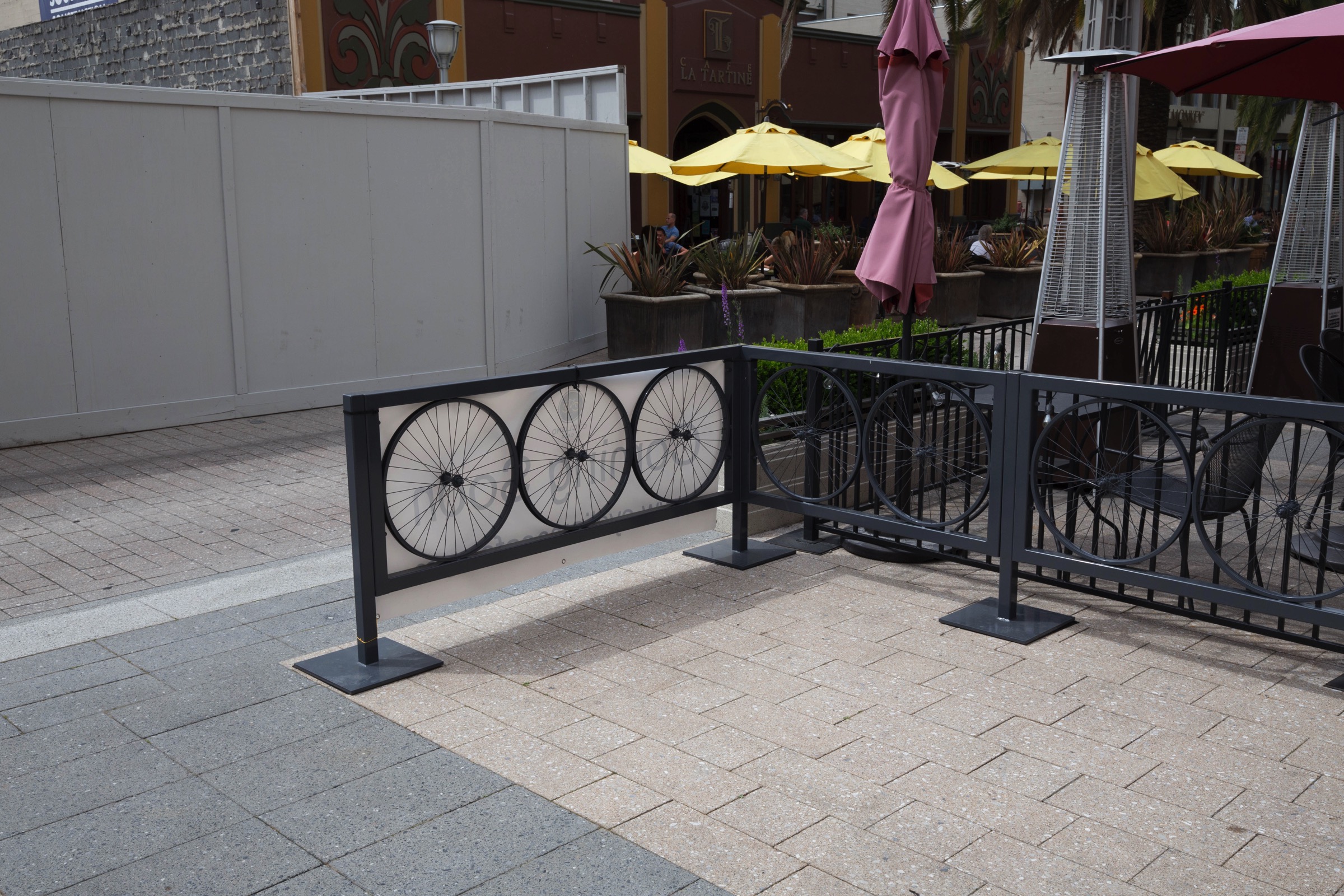 Finally, let me turn back to Redwood City for one last bit of reuse, or should I say “re-cycling”? Cyclismo Cafe, the latest in Redwood City eateries is rapidly pedaling towards their opening. The cafe, which will be located on Theatre Way next to Portobello Grill, seems to be nearly done inside (and, incidentally, they’re now hiring baristas and kitchen prep staff). Cyclismo Cafe has claimed their share of the sidewalk space for outside seating using a very clever custom railing that highlights their cycling theme: