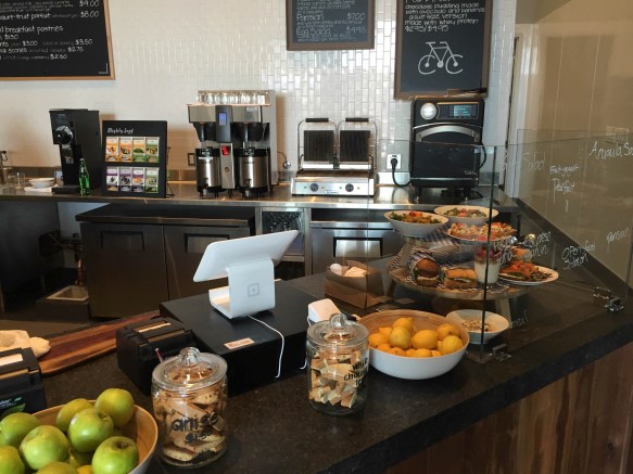 Because our previous visit was only for coffee and pudding, on the day we were running our errands we decided to give some of their organic lunch items a try. Their regular menu isn’t yet on their website, so allow me to fill you in on some of their offerings. First off, they have a nice variety of coffee drinks and teas. Espressos, cappuccinos, lattes, and more, plus plain coffee, cold brew, cocoa, and Mighty Teas of various flavors are on offer. If you are looking for breakfast, they serve a baked egg dish, oatmeal, muesli, a granola-yogurt-fruit parfait, and various breakfast pastries. At lunch they serve a couple of different salads, plus a handful of paninis and sandwiches. And those are just the items on the regular menu: they also seem to have some specials that they display behind glass along with some of the menu items. Pay attention to the writing on the glass that lets you know what they are featuring that day. Finally, Cyclismo also has a number of “grab and go” items in the open fridge, so if you are in a hurry you can keep the visit short.