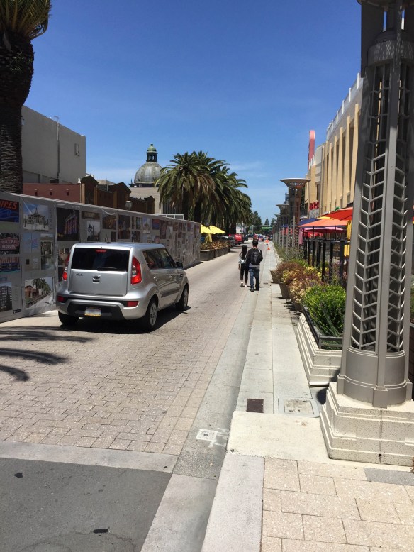 The confusion between cars and pedestrians on Theatre Way is somewhat echoed just around the corner, on Broadway. There we had an island dividing two lanes of traffic, with insufficient signage to indicate how cars in the two lanes should behave once they reached the Jefferson Avenue intersection. Fortunately someone figured out that this design wasn’t ideal, and so the island is being removed. Although the project was slated to take until the end of June, the contractor seems to be working quickly. After removing the palm trees that occupied the center, the curbing that defined the island and the soil that filled it were both swiftly taken away. In the last few days the long, skinny hole that remained was paved over. I don’t know if the entire street will get re-paved or simply re-striped, but either way I can’t imagine that it’ll take much longer. Except for the lack of lane striping, what I saw on my walk this past Wednesday looked smooth and ready to drive on: