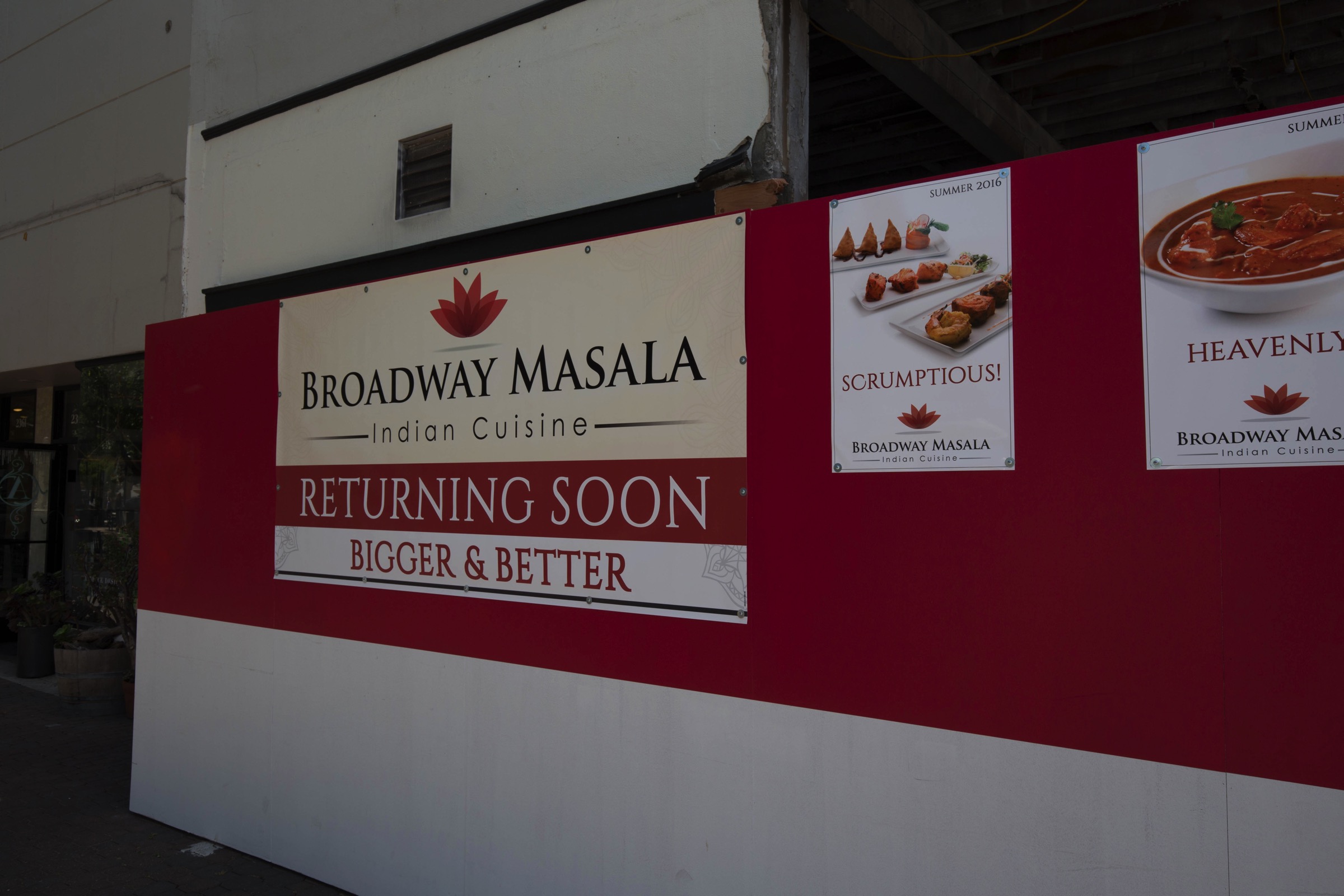 The recent lack of visible progress had me worried, but these signs—and the one around the corner that in large letters pegs the return date as “Summer 2016”—are a great relief. I’m a fan of Broadway Masala and I’m eager to see them serving their guests once again.