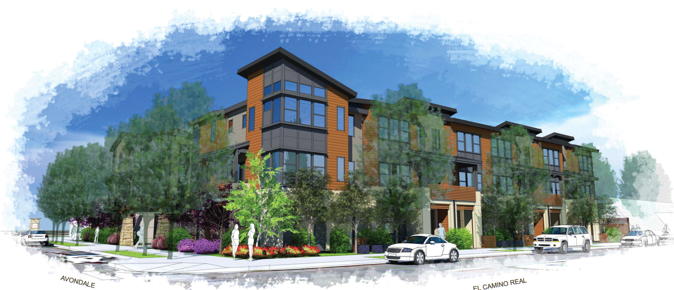 As you can hopefully see, the development will consist of two large buildings, each containing six condos. One building will sit up against the sidewalk along El Camino Real, and the other will sit parallel to it, separated from the first by a driveway that services the ground-level garages. Entry to that driveway, and thus those garages, is from Avondale Avenue. Note the bulb-outs that will be added to the sidewalk at the intersection of El Camino Real and Avondale Avenue: these will not only make the crossing safer for pedestrians, they will also slow traffic entering Avondale from El Camino Real.