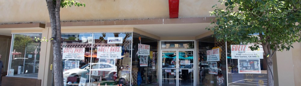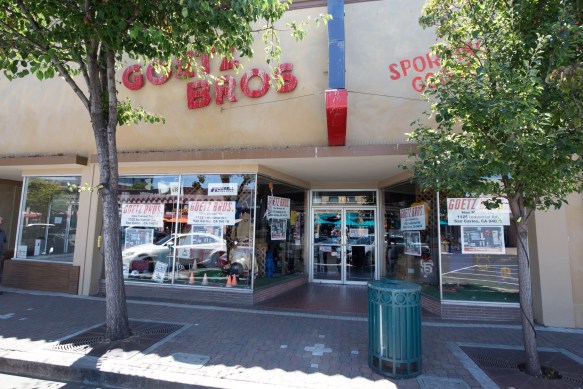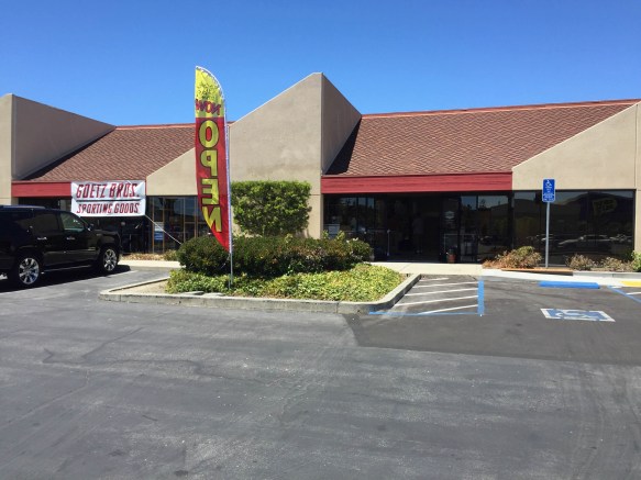 In earlier posts I wrote about two long-time Redwood City businesses that had recently moved out of town: Young’s Auto Parts (to Industrial Road in San Carlos) and Lyngso Garden Materials (to Shoreway Road in San Carlos). To that list I regretfully must add another long-time Redwood City business: Goetz Brothers Sporting Goods. Beginning as a card and gift store some 80 years ago in the Broadway storefront now occupied by Erawan Thai Restaurant, since 1958 the business has been located at 2629 Broadway. But no longer. While I can rejoice that the family remains in business, that business is now located in San Carlos, at 1125 Industrial Blvd. You’ll find it between Roadrunner Sports (a store that specializes in running and walking shoes, and apparel) and California Fly Shop (who specializes in fly fishing gear), on the very south side of the Brittan Corners shopping center. Although they will lose the casual walk-by traffic that their former location had, they will be very visible from the Best Buy shopping center (although separated from it by a chain-link fence) and, presumably, from Highway 101 where I assume they will join their neighboring merchants on the communal sign. I dropped by on Wednesday to pay their new location a visit and noted that, as owner Steve Goetz told the Daily Journal, they do indeed have more parking and a bigger store. On the inside, the store feels more open and inviting, and everything seems much more organized and easy to find. Anyone needing sporting equipment would be well served to pay them a visit in their new home.