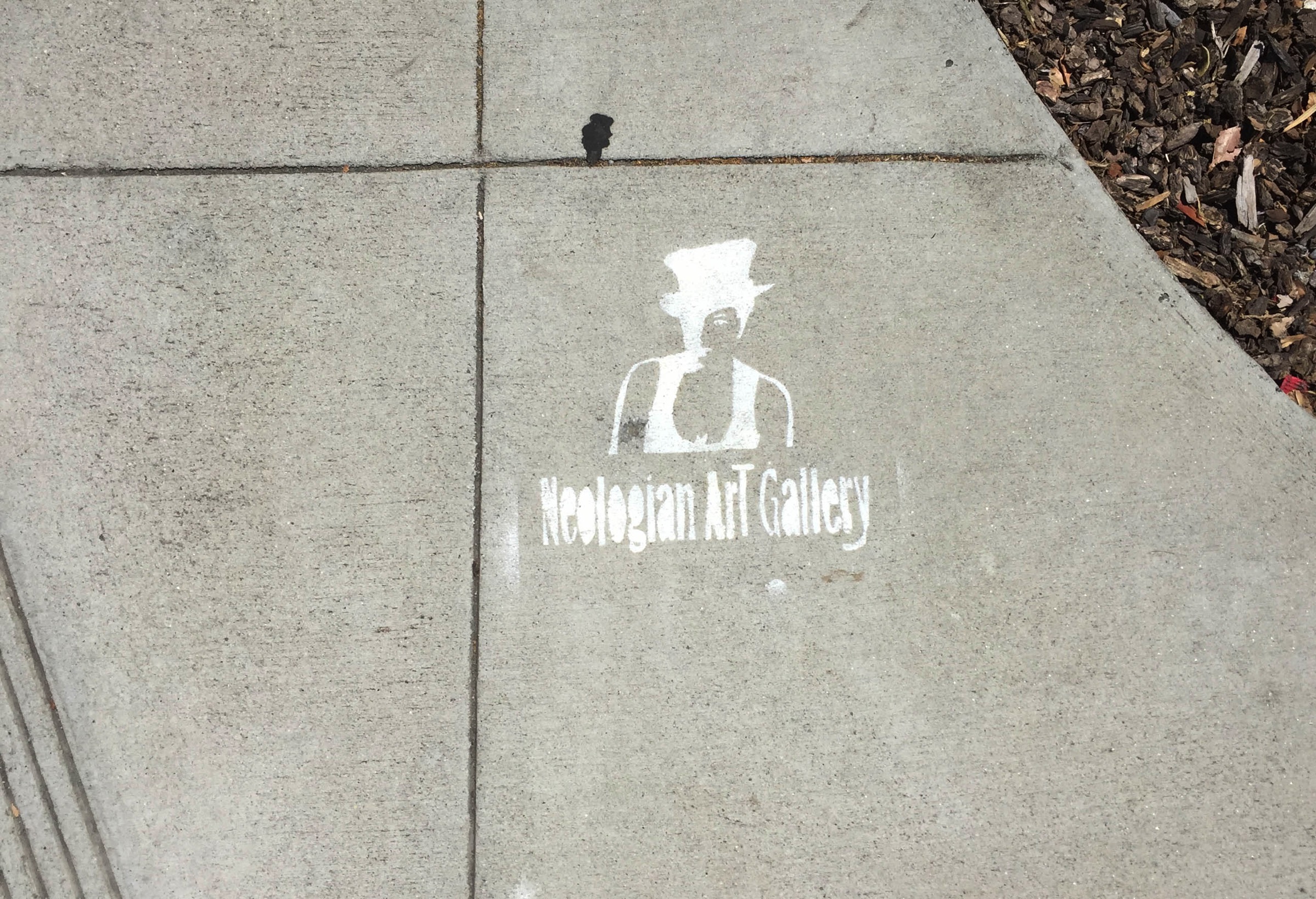 We’ve gained a lot of neat sidewalk paintings lately, but this one isn’t one of them. This is advertising, pure and simple, on public property. I can’t imagine that this is legal! It advertises the Neologian Art Gallery, which isn’t even located in Redwood City—it’s in San Mateo. In case someone from the city would like to take action, I’ll note that there is another of these on the sidewalk along Hopkins Avenue, in front of Stafford Park.