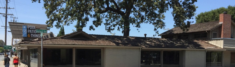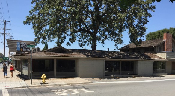 Last week’s post, which I titled Along the Way, began with a map of my walk and a mention that I went farther than my primary goal, which was the Buckingham Apartments on Buckingham Avenue. I walked farther down El Camino Real than necessary because I wanted to peer into the former Pool, Patio & Things building (also known as the Franciscan Forge). Pool, Patio & Things closed over a year ago. At that time I was told that the building had been sold and would be divided up into multiple office spaces. However, since then there has been absolutely no visible activity at the site. My walk there confirmed that indeed, nothing really is going on: the building still sits empty, as it has done since the business closed. I checked the permits on the site and noted that there is a current one, issued in March of this year, for minor renovations consistent with what I had been told. But it has been six months since the permit was issued, and…nothing.