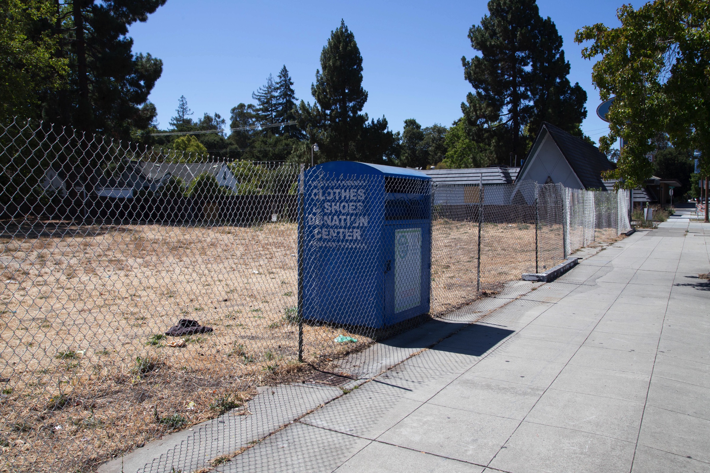 I see a number of similarities between this project and the twelve-unit one that should soon break ground at 150 El Camino Real. I last wrote about that project in A Lot to Remember, and since then there has been no visible activity on the property. Actually, that’s not quite true: just a couple of days ago workers enclosed the property with chain link fencing. It may in fact be construction fencing, signaling that groundbreaking is just around the corner. But I suspect that in reality it may just be a way to keep people from dumping their cast-offs on the property. For a while now there have been two of those “charity bins” on El Camino Real side of the parcel, and lately someone dumped a bunch of rubbish next to the bins. After a couple of days that rubbish was cleaned up, and one of the bins disappeared. Not too long after that, the fence was installed. Which, I was amused to see, they installed in such a way as to render the remaining bin inaccessible: