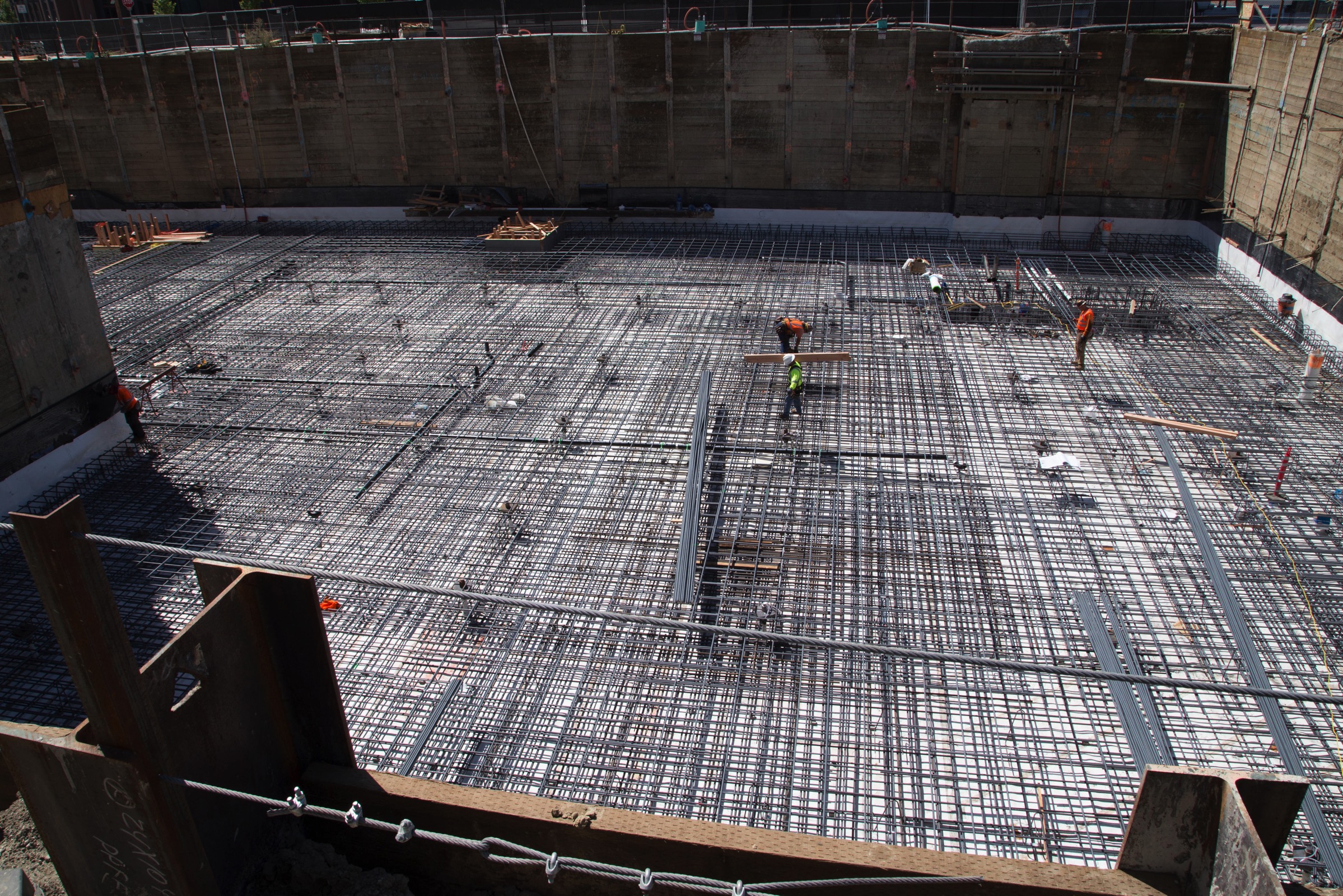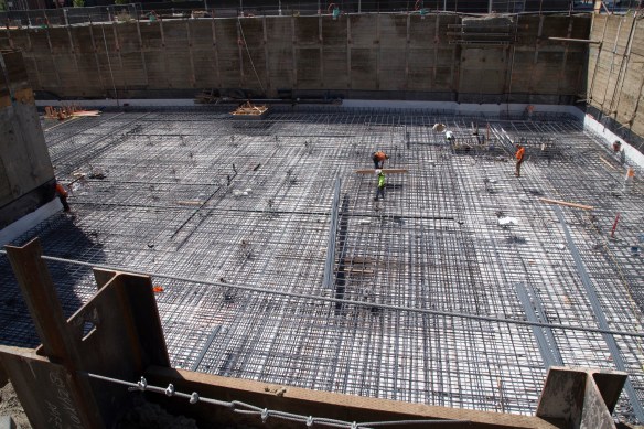 I dropped by again this week and now, with that floor hard enough to walk on, they’re working on the supporting pillars that will hold up the upper level of the parking garage—and indeed, the entire building.