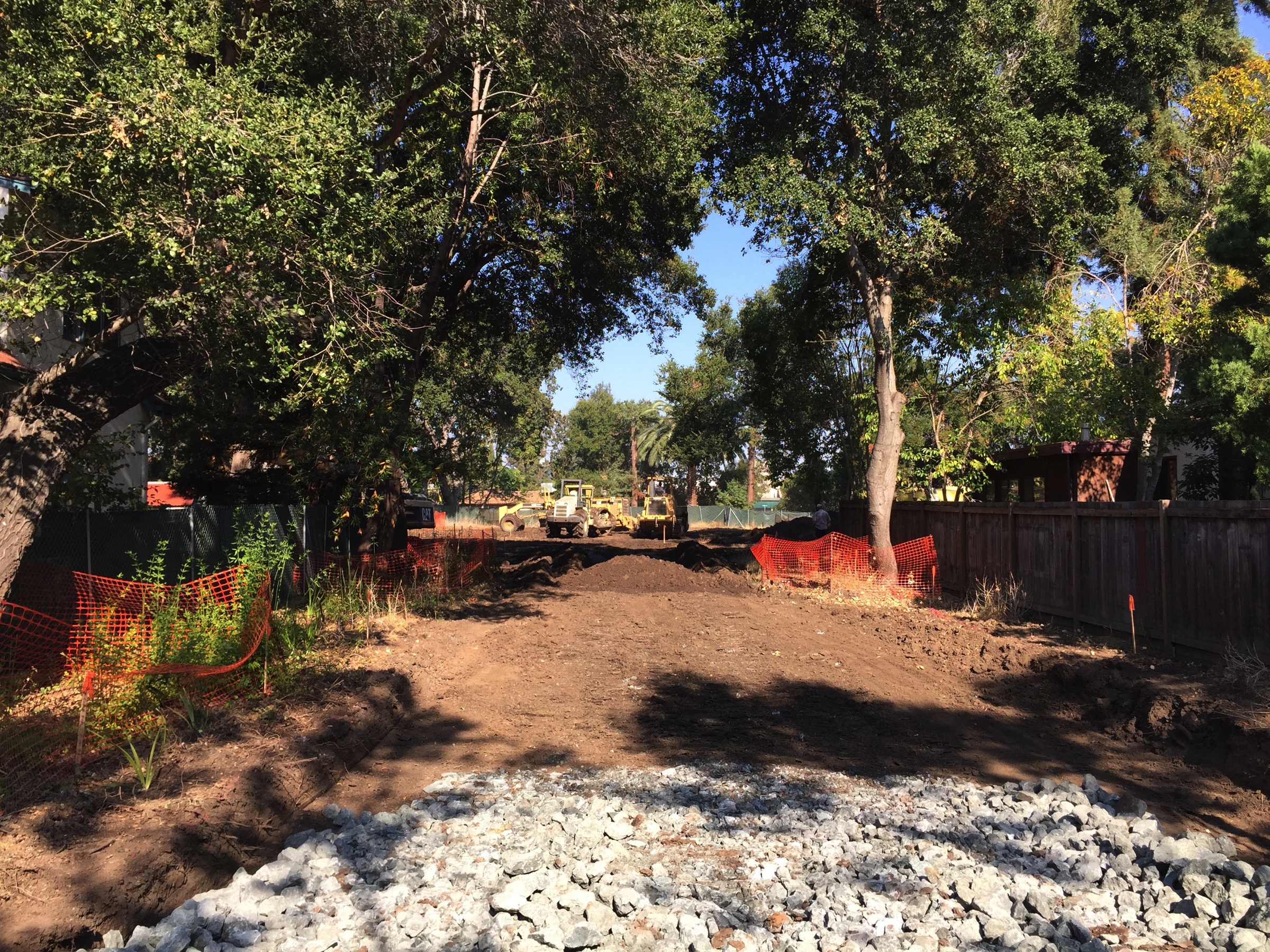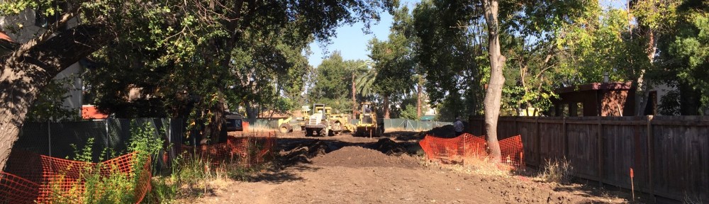 One of these latter projects is the set of eight homes being built on Finger Avenue, near El Camino Real and Redwood City’s border with San Carlos. Construction fences went up many months ago and demolition of the three old homes that occupied the site occurred soon after, but since then the project has simply sat, untouched. But that all changed just a couple of days ago, when the heavy equipment and surveying crews moved in. The site is now a busy hub of activity, with men staking out the various homebuilding sites and heavy equipment now pushing dirt around: