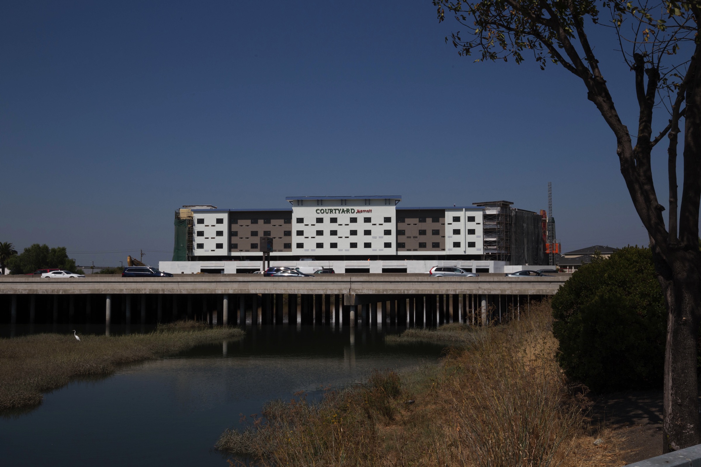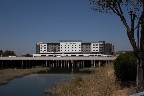 - 650 Bair Island Road (One Marina Hotel) – the coverings have been removed from the side facing Highway 101, revealing that the final building will indeed look a lot like the renderings supplied with the project plans. There are still plenty of construction fences limiting access to this one, however.