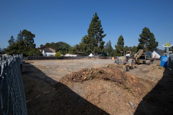 After carefully scrutinizing the city’s development project list, I noted that one of the projects listed under “Approved” now seems to be under construction. I’ve been watching the stalled project at 150 El Camino Real with great interest for some time now. On this empty lot next to the old Mountain Mike’s pizza restaurant the developer will be building a twelve-unit condominium complex. For various reasons that property has sat idle for many years now, with only minor signs of activity. Recently a chain-link fence went up around the property, and with the addition of the green fabric we now have a proper construction site. And an active one, it seems: there is now some heavy equipment on the site, ready to start prepping the lot and digging foundations.
