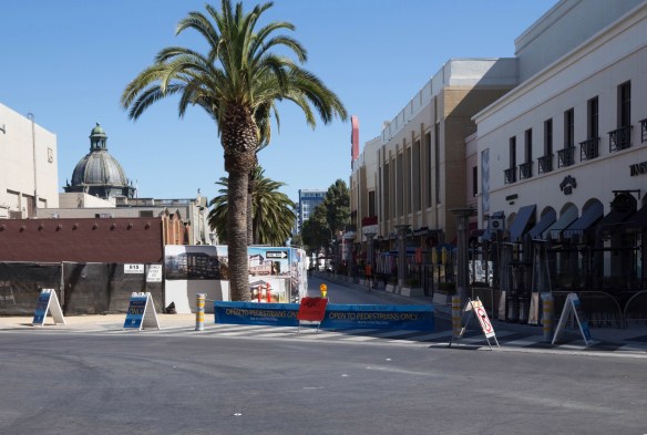 Back in June, in my post Street Walking, I noted that people were treating Theatre Way as a pedestrian mall even though it is a public street. Based on the pedestrian behavior I had observed, in that post I suggested that the city close Theatre Way. Apparently the city was having the same thoughts, because, on a trial basis at least, they did. While the wording of their announcement implies that they may reopen Theatre Way to traffic at some point—perhaps when the 815 Hamilton Street project is complete—I sincerely hope that they don’t. Theatre Way is lined with shops and restaurants, and it only makes sense to allow people to dart back and forth from one side to the other without having to utilize the crosswalks at either end of the block. I hope that they see that unconventional changes like these—removing the Broadway island, closing Theatre Way—can have real positive benefits for pedestrians, cyclists, and motorists alike.